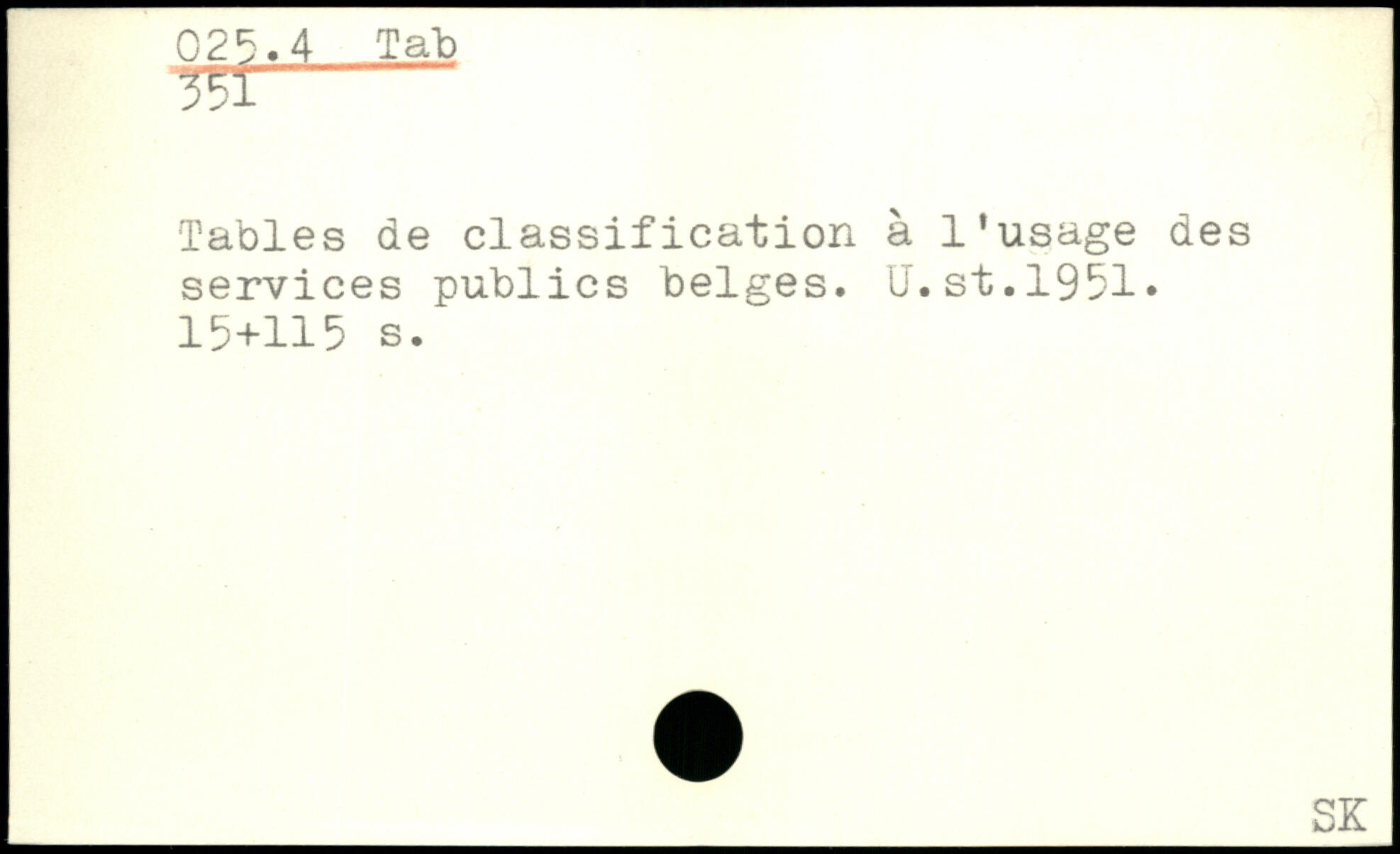 Tables de classification à l’usage des services publics belges. U. st.1951.