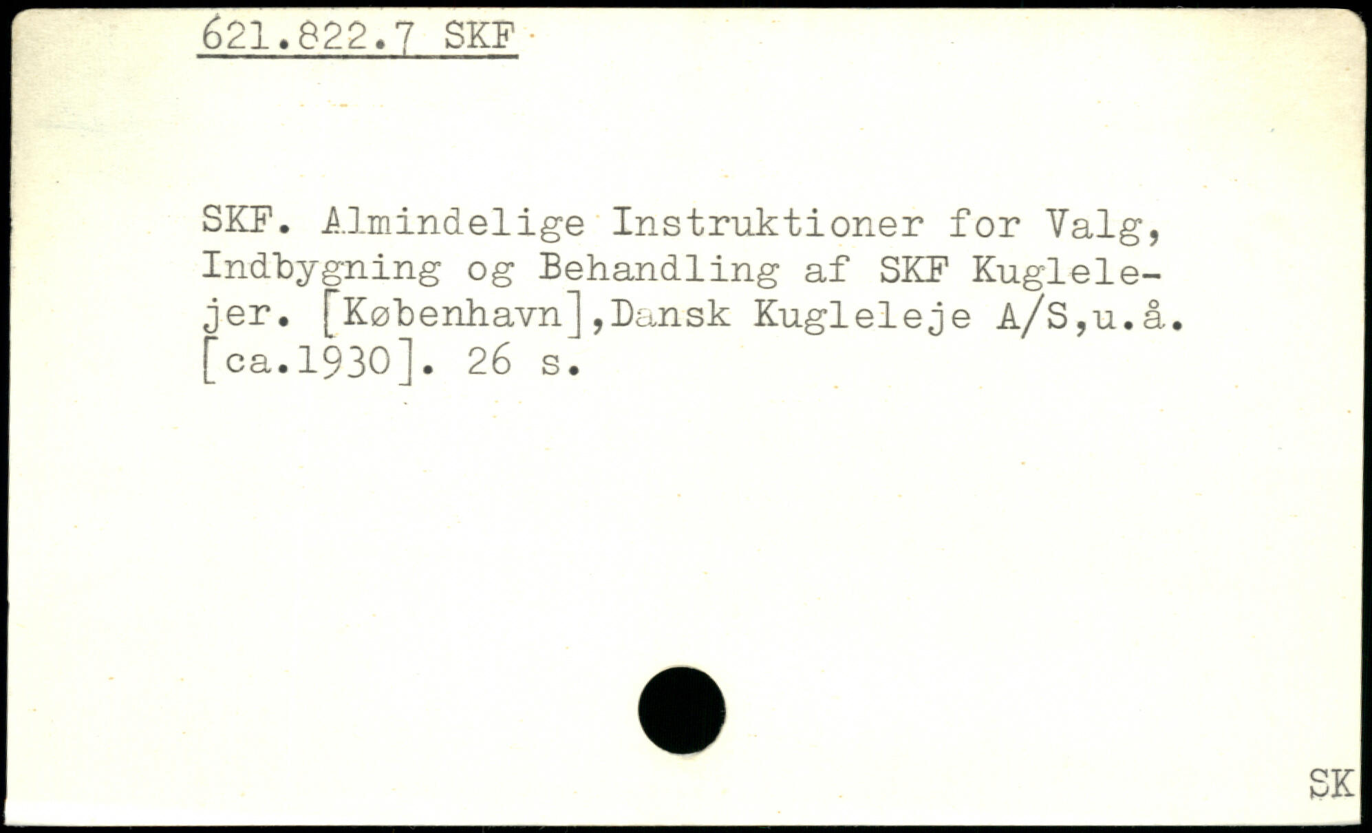 SKF. Almindelige Instruktioner for Valg, Indbygning og Behandling af SKF Kuglelejer. [København],Dansk Kugleleje A/S,u.å. [ca.1930].