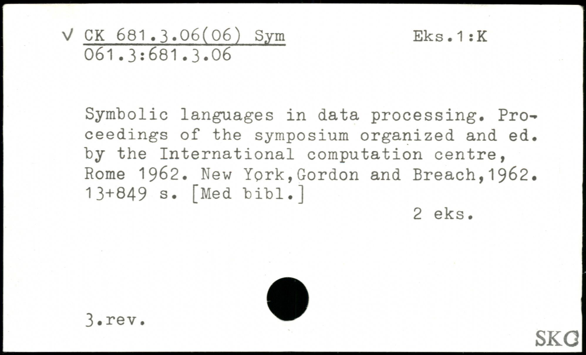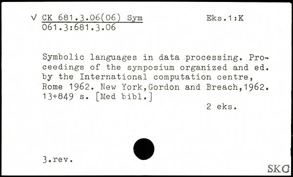 Symbolic languages in data processing. Proceedings of the symposium organized and ed. by the International computation centre, Rome 1962.