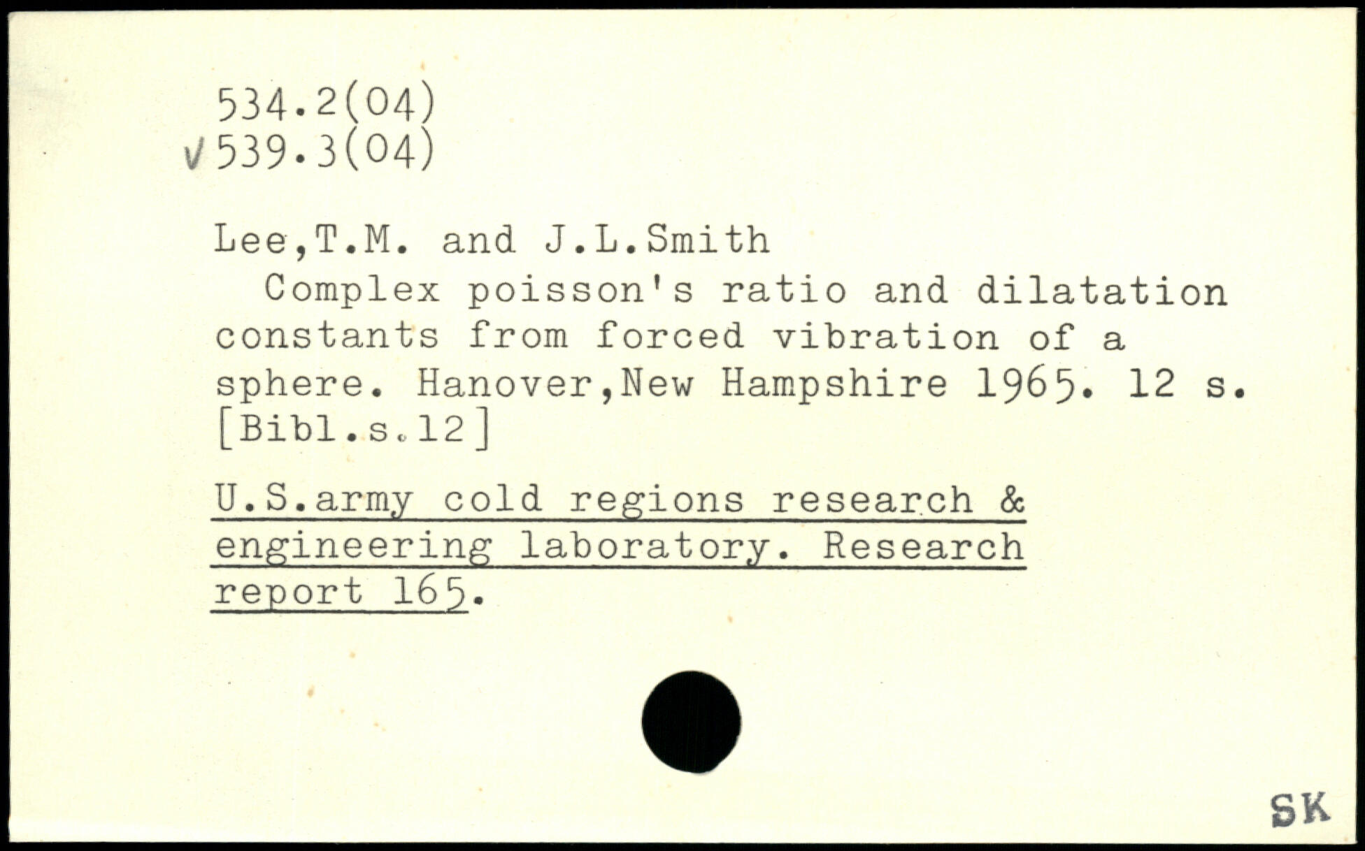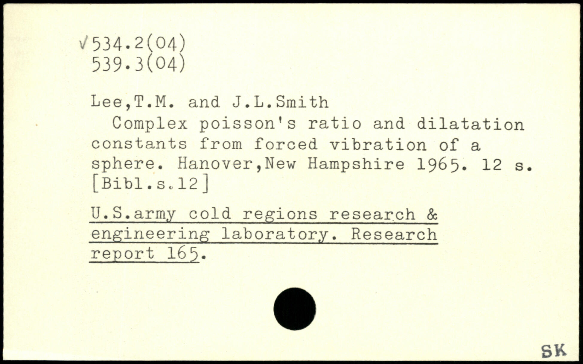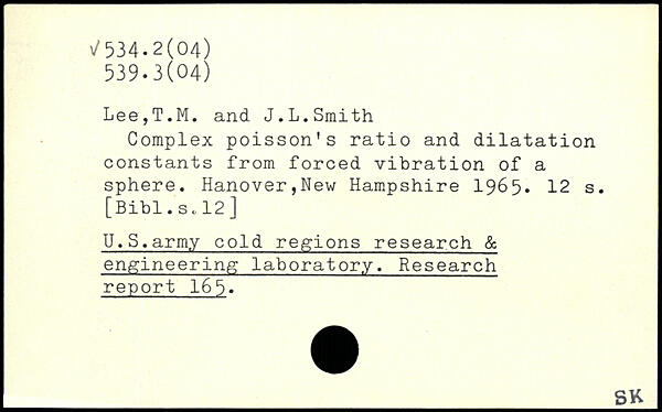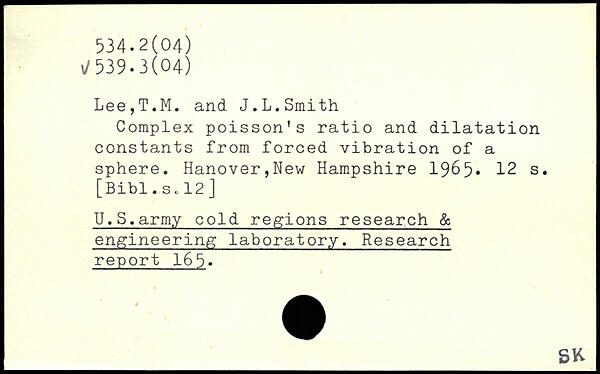 Complex poisson's ratio and dilatation constants from forced vibration of a sphere. Hanover,New Hampshire 1965