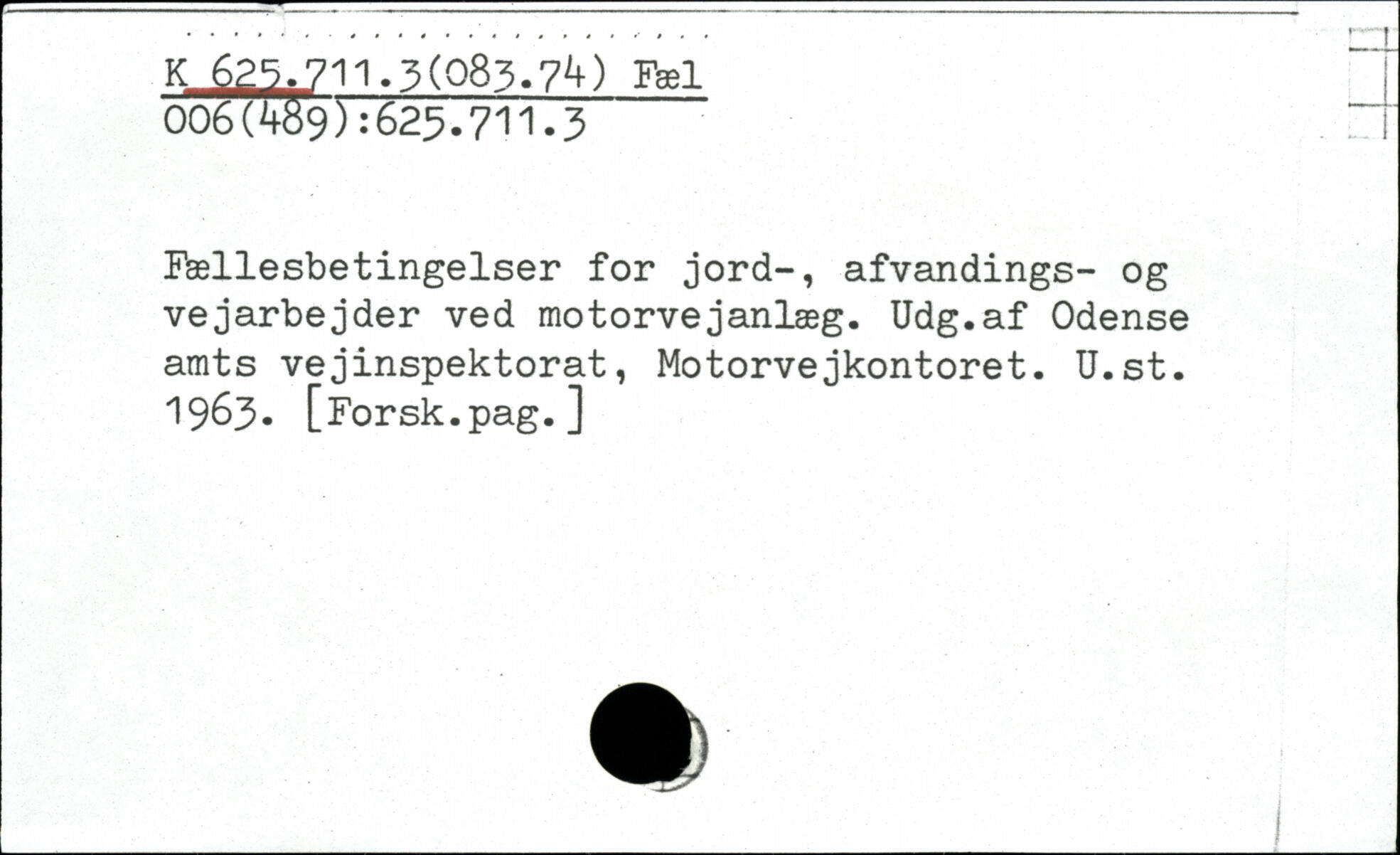 Fællesbetingelser for jord-, afvandings- og vejarbejder ved motorvejanlæg. Udg.af Odense amts vejinspektorat, Motorvejkontoret. U.st. 1963. [Forsk.pag.]
