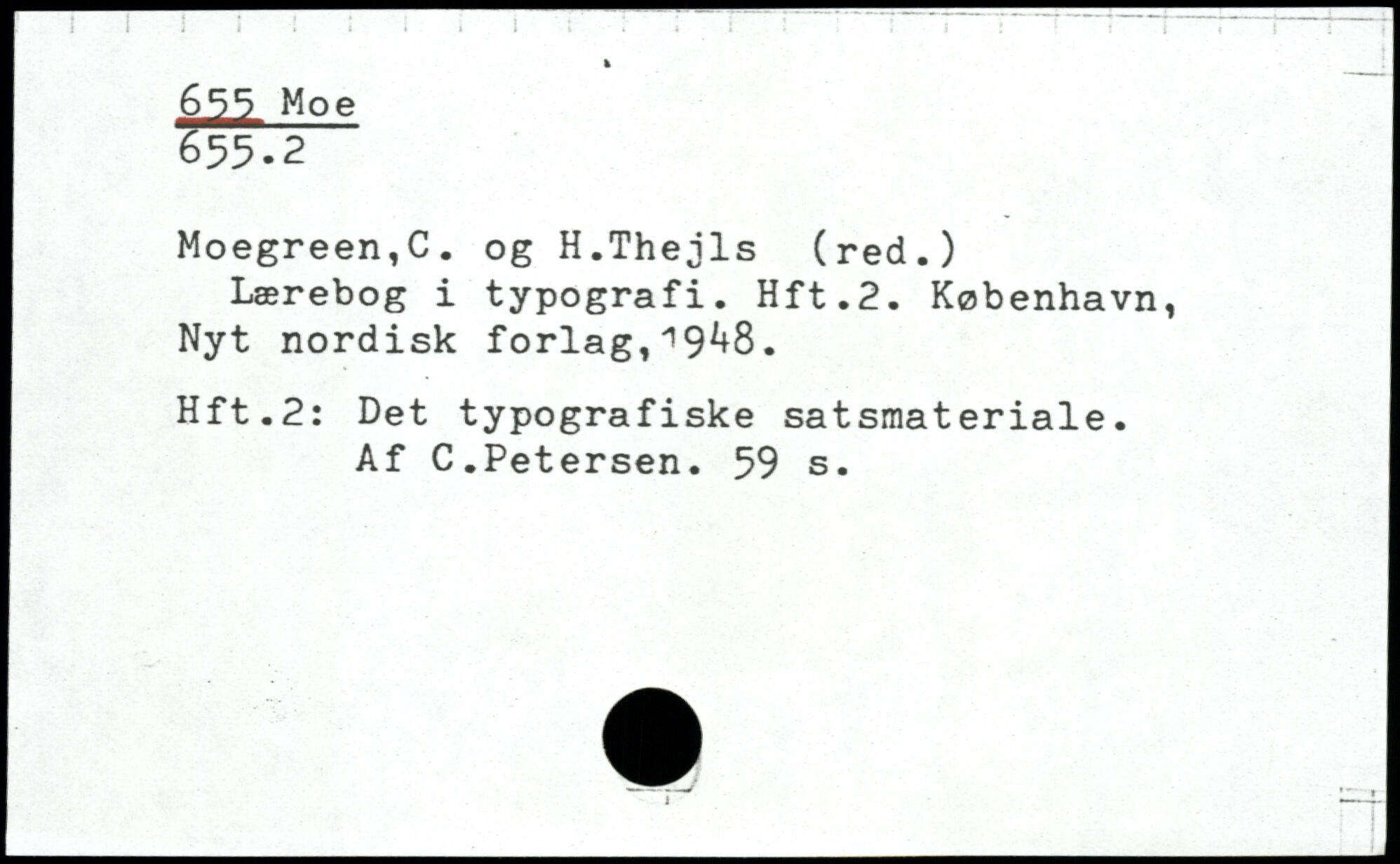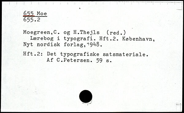 Lærebog i typografi. Hft.2. København, Nyt nordisk forlag,^9^8. Hft.2: Det typografiske satsmateriale. Af C.Petersen.