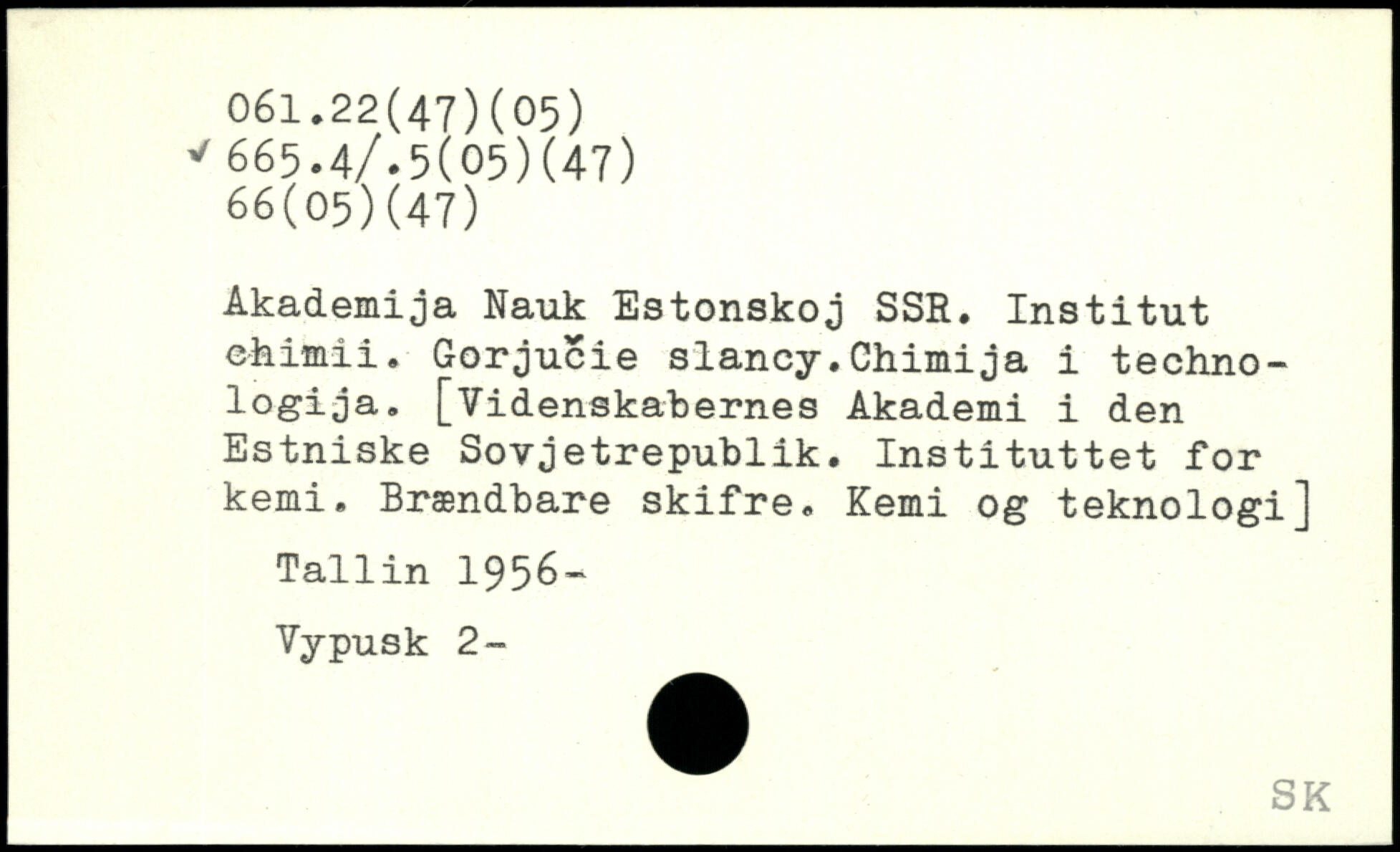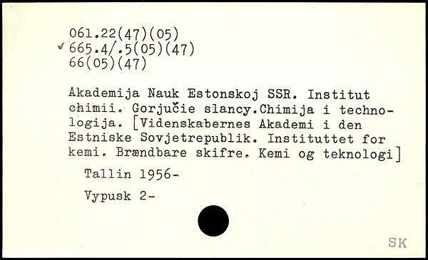Akademija Nauk Estonskoj SSR. Institut ehimii. Gorjucie slancy.Chimija i techno-logija. [Videnskabernes Akademi i den Estniske Sovjetrepublik. Instituttet for kemi. Brændbare skifre. Kemi og teknologi] Tallin 1956- Vypusk 2-