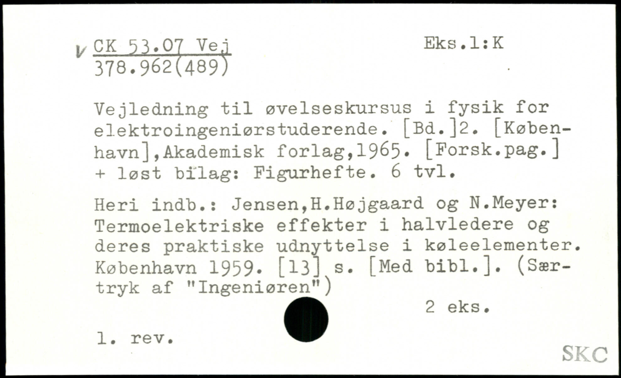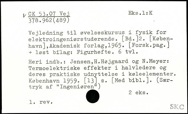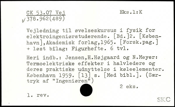 Vejledning til øvelseskursus i fysik for elektroingeniørstuderende. [Bd.]2. [København] ,Akademisk forlag,1965. [Forsk.pag.] + løst bilag: Figurhefte. 6 tvl. Heri indb.: Jensen,H.Højgaard og N.Meyer: Termoelektriske effekter i halvledere og deres praktiske udnyttelse i køleelementer.