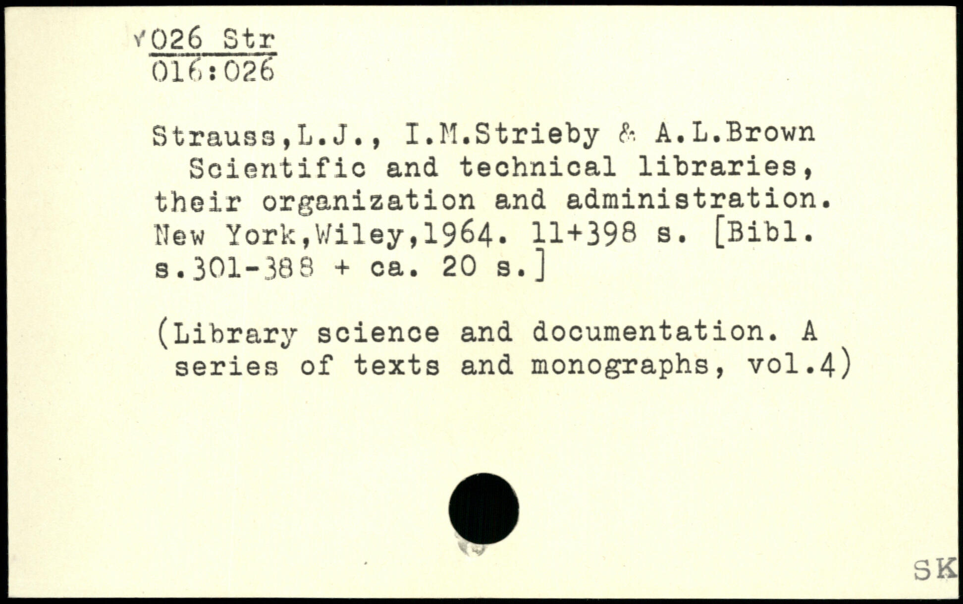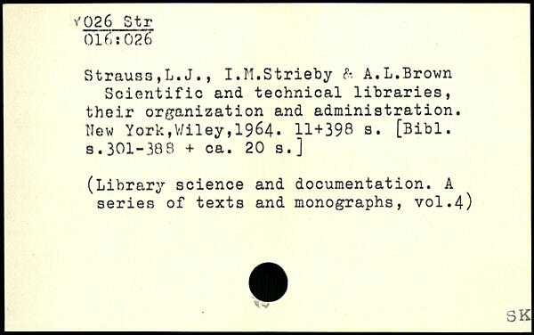 Strauss,L.J., I.M.Strieby ft A.L.Brown Scientific and technical libraries, their organization and administration.