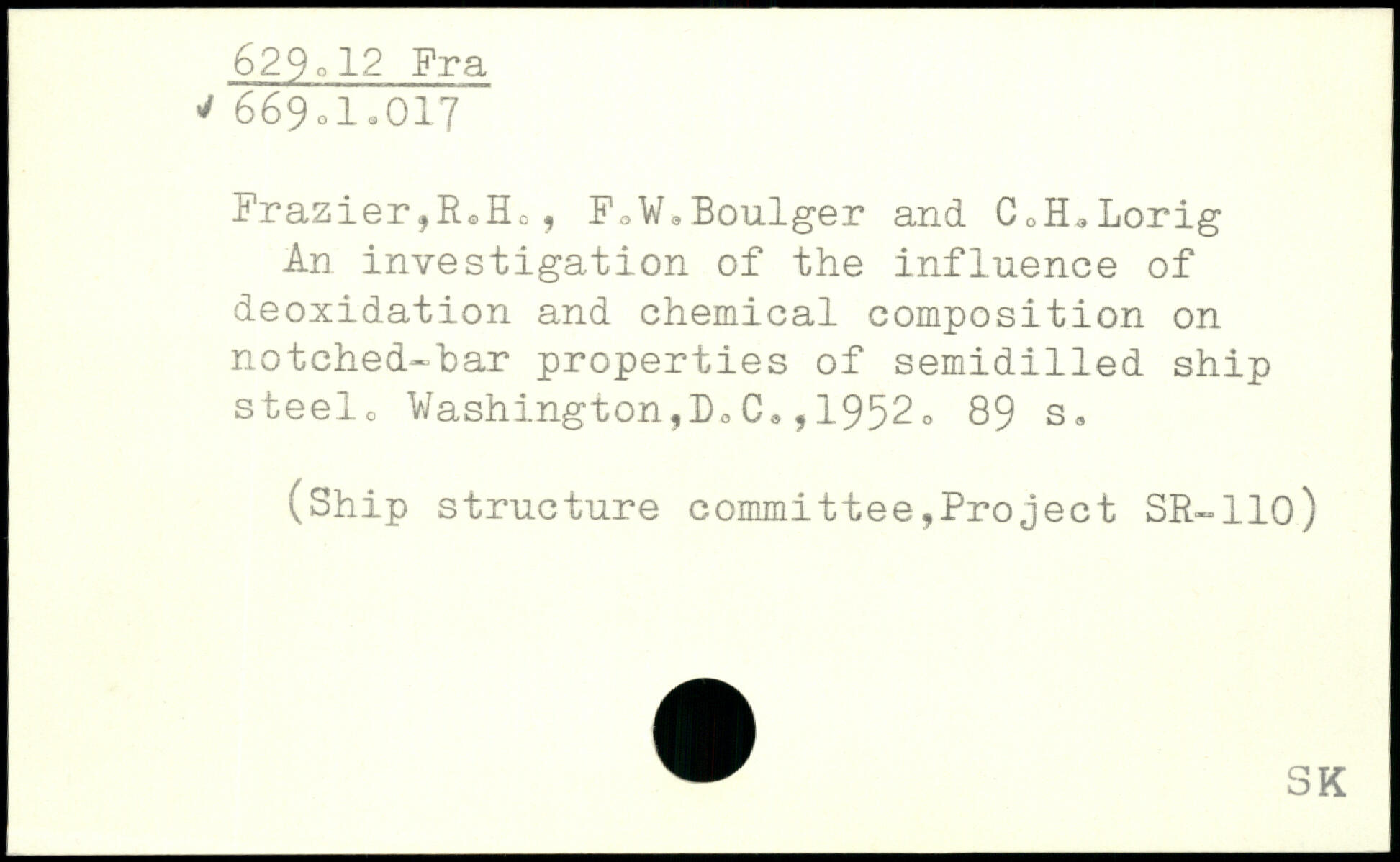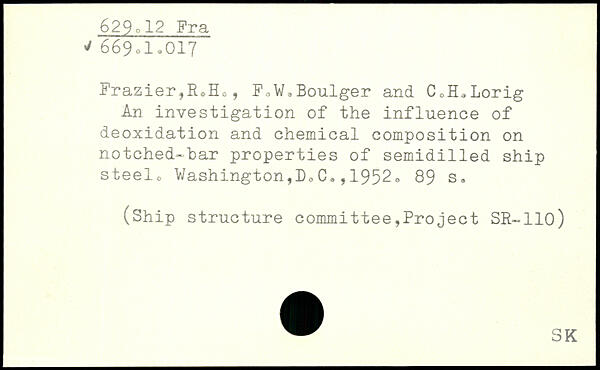Frazier,R.Ho, FoW.Boulger and CoH.Lorig An investigation of the influence of deoxidation and chemical composition on notched-bar properties of semidilled ship steelc Washington,D,C.,1952