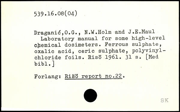Draganic,0.G., N.W.Holm and J.E.Maul Laboratory manual for some high-level chemical dosimeters. Ferrous sulphate, oxalic acid, ceric sulphate, polyvinylchloride foils. Riso 1961.