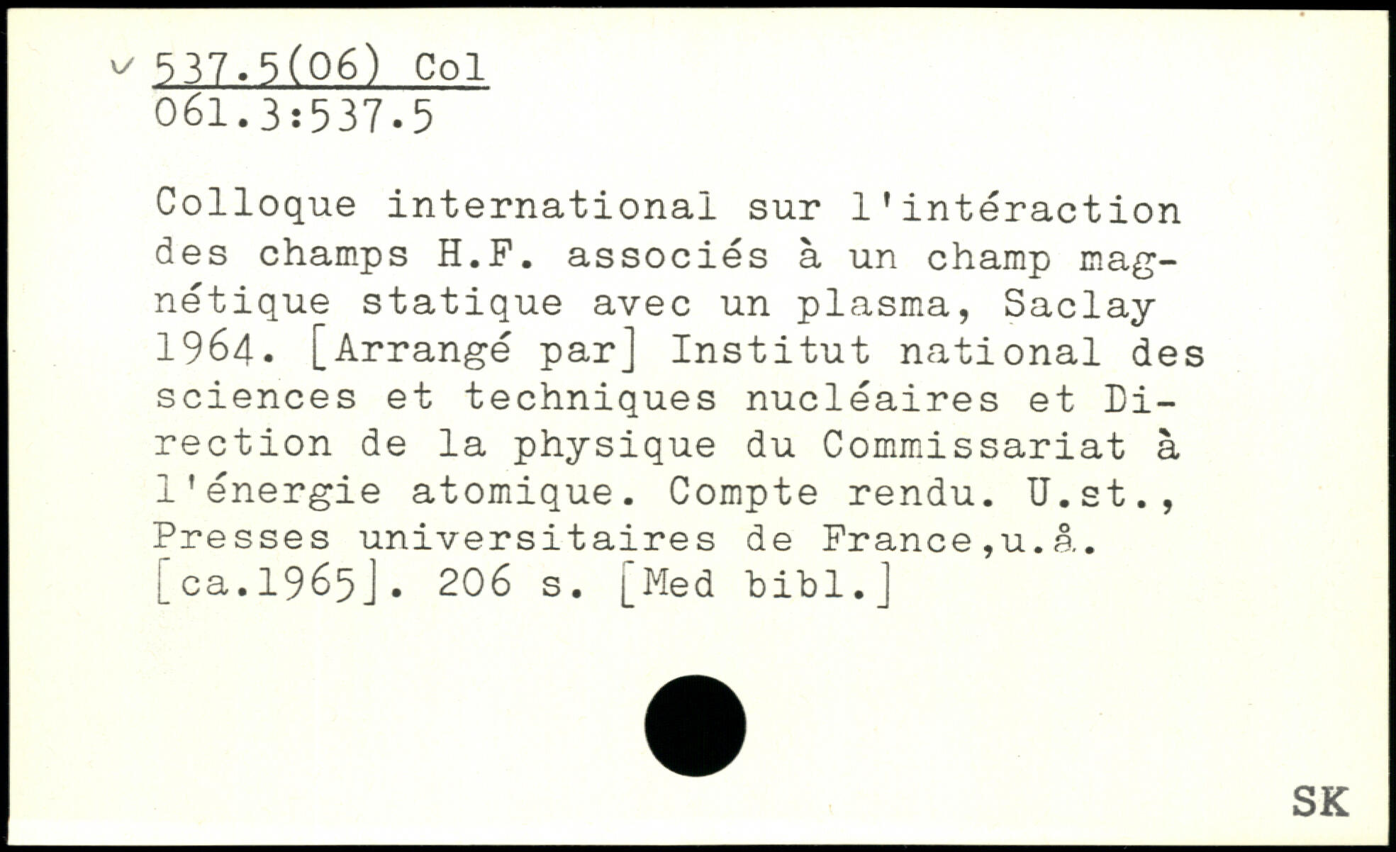 Colloque international sur l'interaction des champs H.F. associés à un champ magnétique statique avec un plasma, Saclay 1964. [Arrangé par] Institut national des sciences et techniques nucléaires et Direction de la physique du Commissariat à l'énergie atomique. Compte rendu. U.st., Presses universitaires de France,u.â.