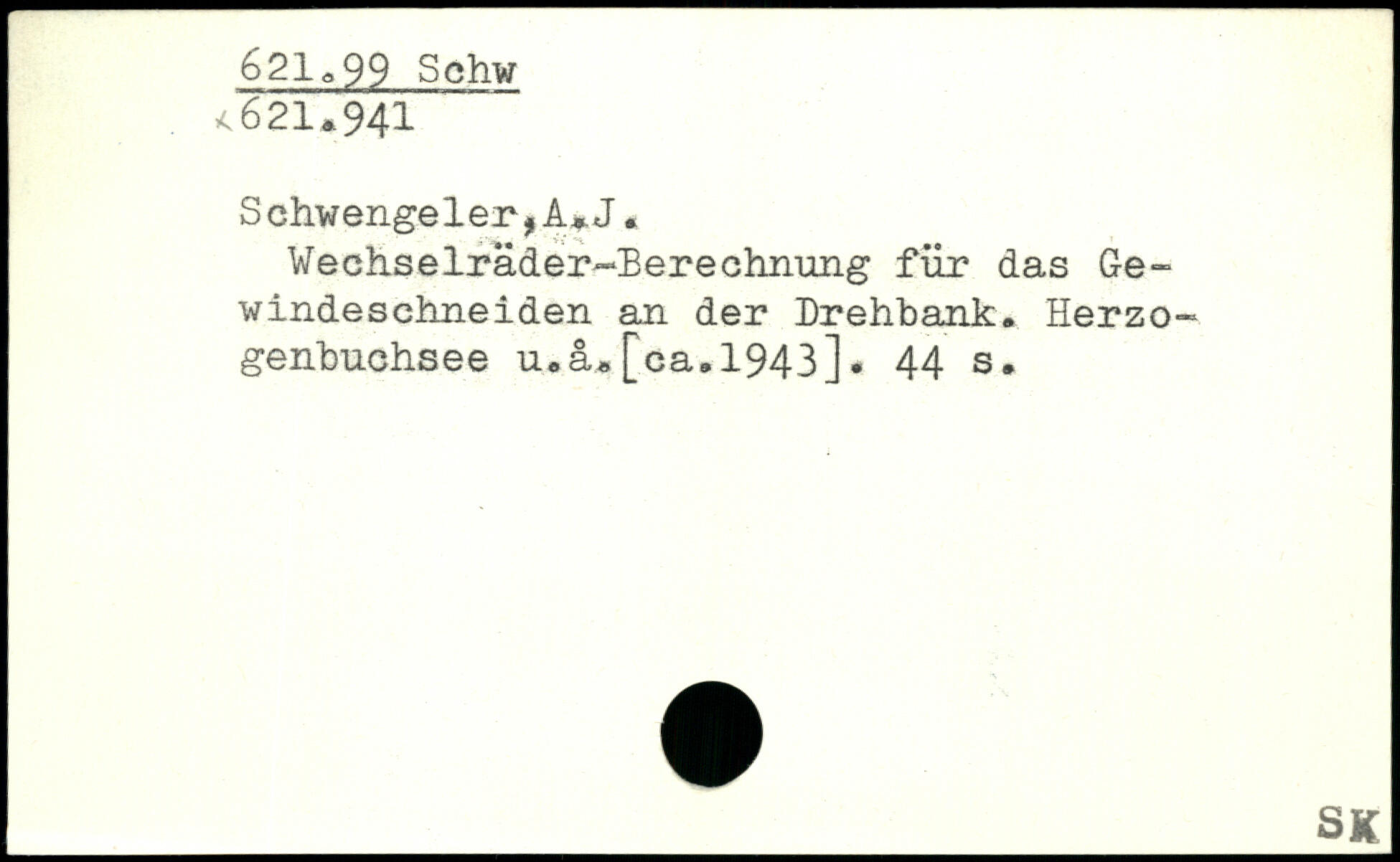 Wechselräder-Berechnung für das Gewindeschneiden an der Drehbank. Herzo-genbuchsee u.ä,[ca.1943].