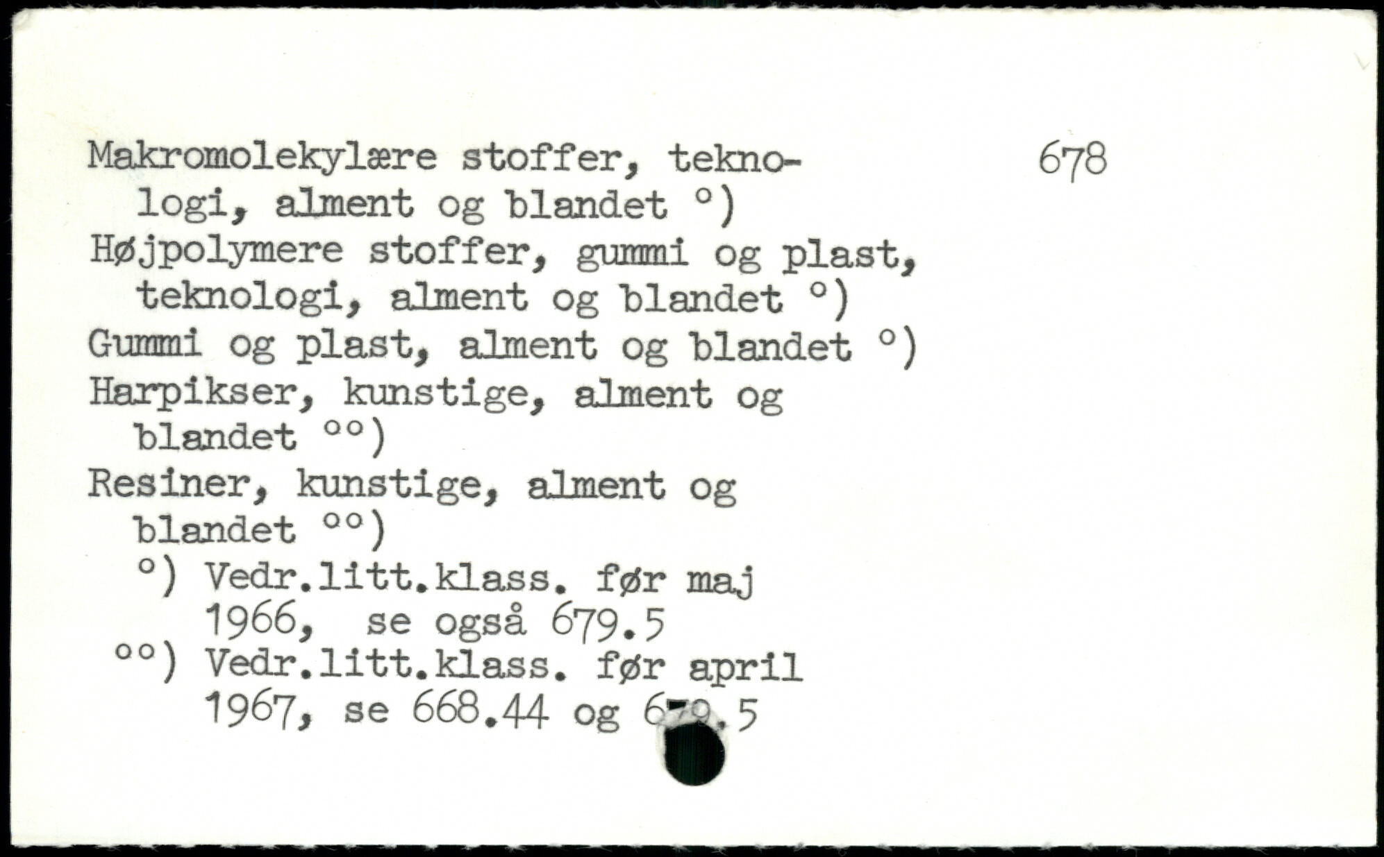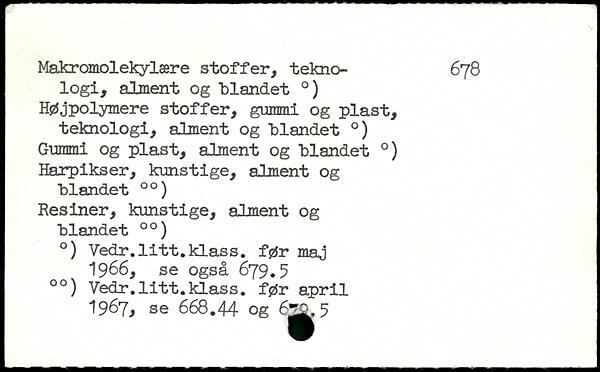 Makromolekylære stoffer, tekno- 678 logi, alment og "blandet .) Højpolymere stoffer, gummi og plast, teknologi, alment og "blandet .) Gummi og plast, alment og "blandet .) Harpikser, kunstige, alment og "blandet 00) Resiner, kunstige, alment og "blandet 00) .) Vedr.litt.klass. før maj 1966, se også 679.5 00) Vedr.litt.klass. før april 1967. se 668.44 og 6^^ 5