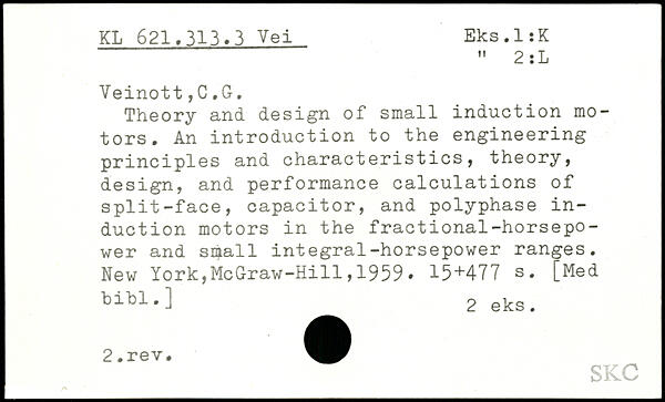 Theory and design of small induction motors. An introduction to the engineering principles and characteristics, theory, design, and performance calculations of split-face, capacitor, and polyphase induction motors in the fractional-horsepower and small integral-horsepower ranges.