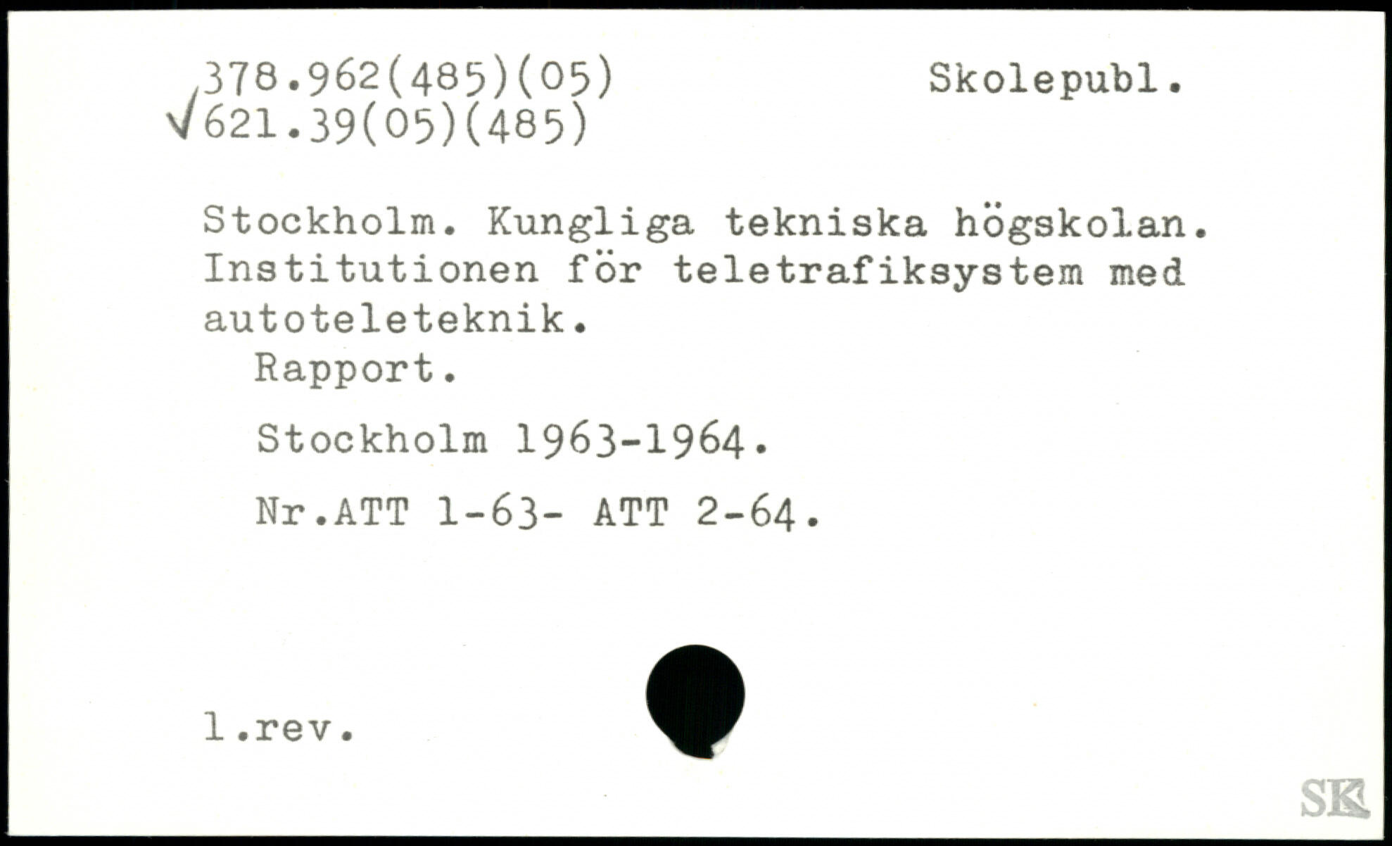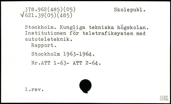 Stockholm. Kungliga tekniska högskolan. Institutionen för teletrafiksystem med autoteleteknik. Rapport.