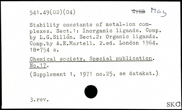Stability constants of metal-ion complexes. Sect.1: Inorganic ligands. Comp, by L.G.Sillén. Sect.2: Organic ligands. Comp.by A.E.Martell.