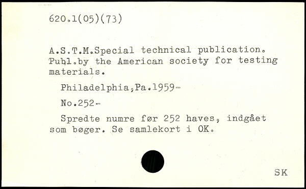 A.S.T.M.Special technical publication,, Puhlohy the American society for testing materials. Philadelphia 9Pa. 1959" No.252- Spredte numre før 252 haves, indgået som bøger. Se samlekort i OK.