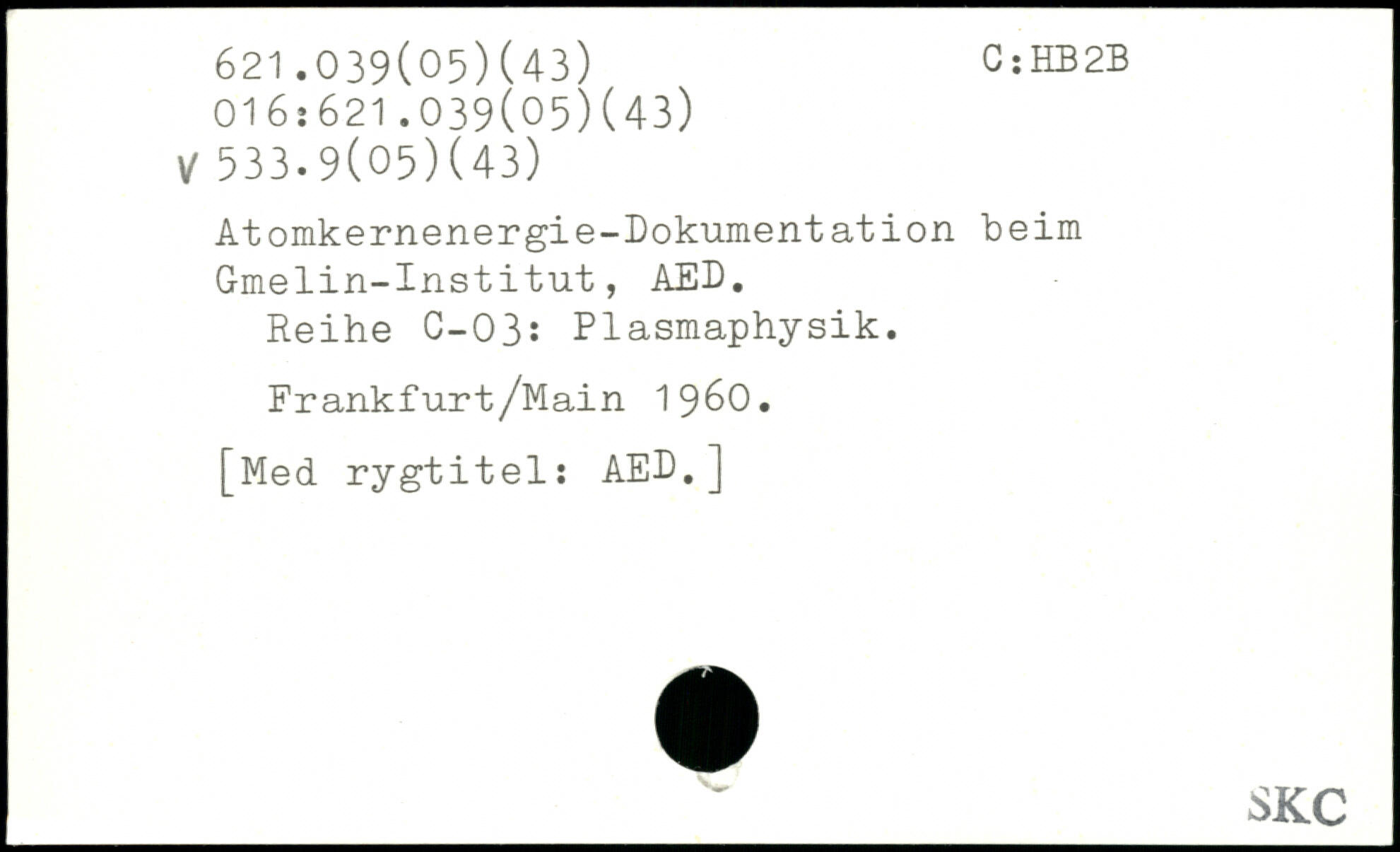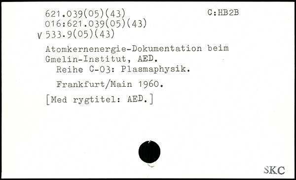 Atomkernenergie-Dokument ation beim Gmelin-Institut, AED. Reihe C-03: Plasmaphysik. Frankfurt/Main 1960.