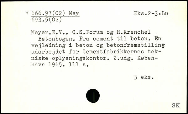 Meyer,E.V,, C.S.Forum og H.Krenchel Betonbogen. Fra cement til Beton. En vejledning i beton og betonfremst1111ng udarbejdet for Cementfabrikkernes tekniske oplysningskontor.