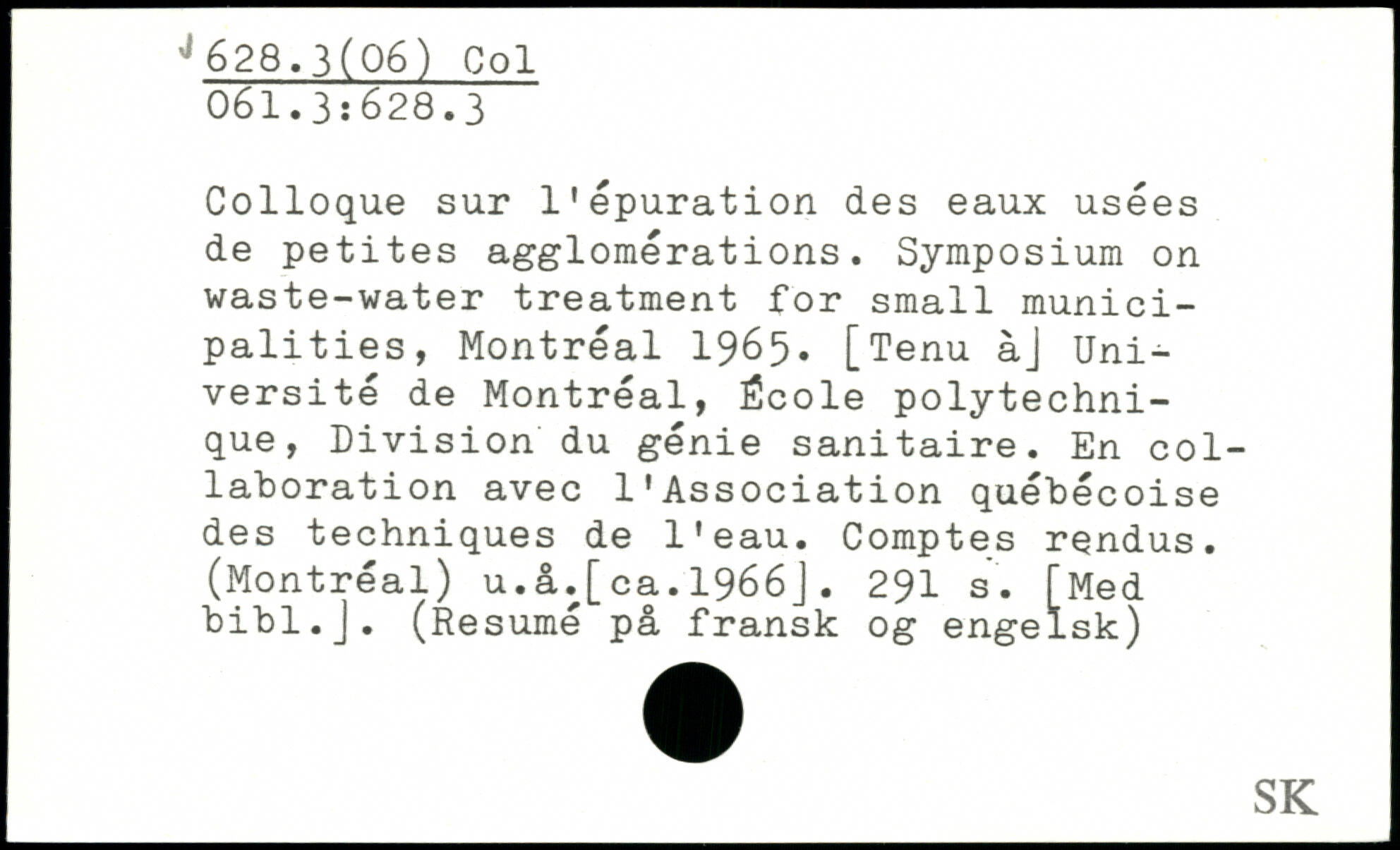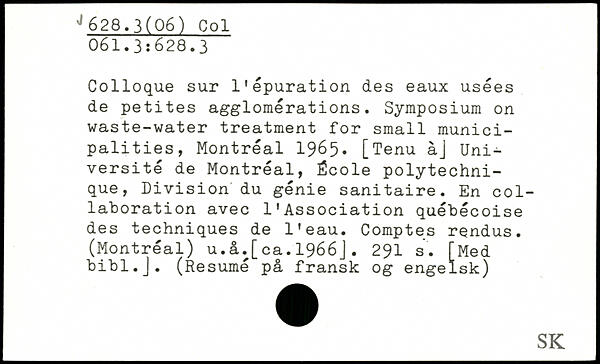 Colloque sur l'épuration des eaux usées de petites agglomérations. Symposium on waste-water treatment for small municipalities, Montréal 1965, [Tenu àj Université de Montréal, École polytechnique, Division du génie sanitaire. En collaboration avec l’Association québécoise des techniques de l’eau. Comptes rendus. (Montréal) u.â.[ca.1966J.