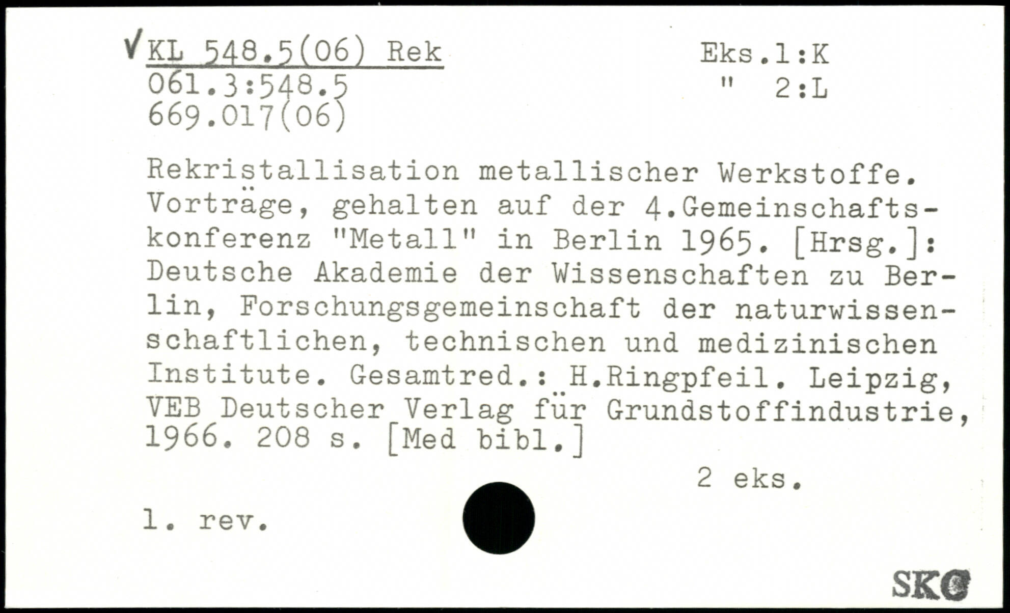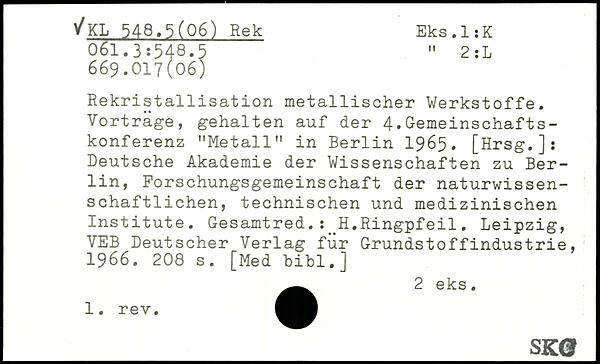 Rekristallisation metallischer Werkstoffe. Vortrage, gehalten auf der 4.Gemeinschaftskonferenz "Metall" in