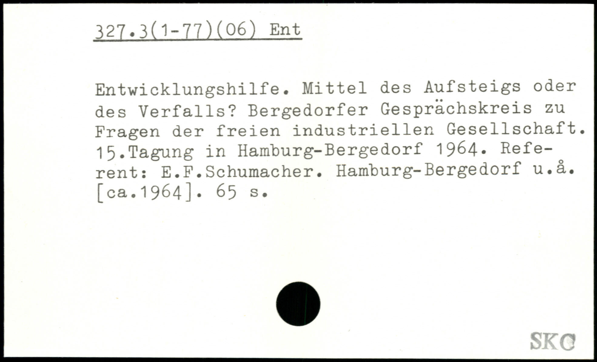 Entwicklungshilfe. Mittel des Aufsteigs oder des Verfalls? Bergedorfer Gesprächskreis zu Fragen der freien industriellen Gesellschaft. 15.Tagung in Hamhurg-Bergedorf 1964, Refe-rent: E.F.Schumacher. Hamhurg-Bergedorf u.ä. [ca.1964].65s.