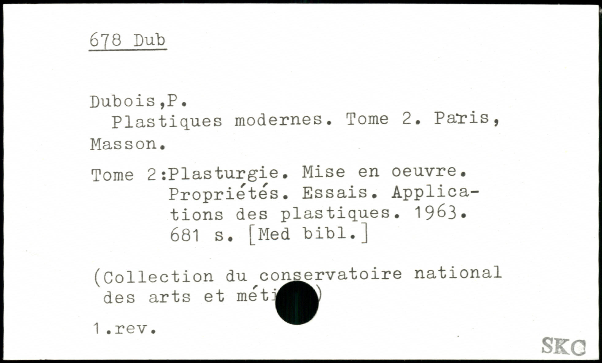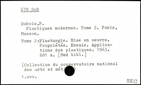 Plastiques modernes. Tome 2. Paris, Masson. Tome 2îPlasturgie. Mise en oeuvre. Propriétés. Essais. Applications des plastiques. 1963.