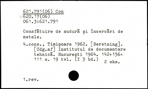 Consfatuire de sudura çi încercari de metale. ^f.cons., Timiçoara 1962. [Beretning], [Udg.af] Institutul de documentare tehnica. Bucureçti 196.+. 1^2+156+