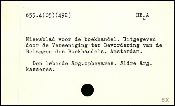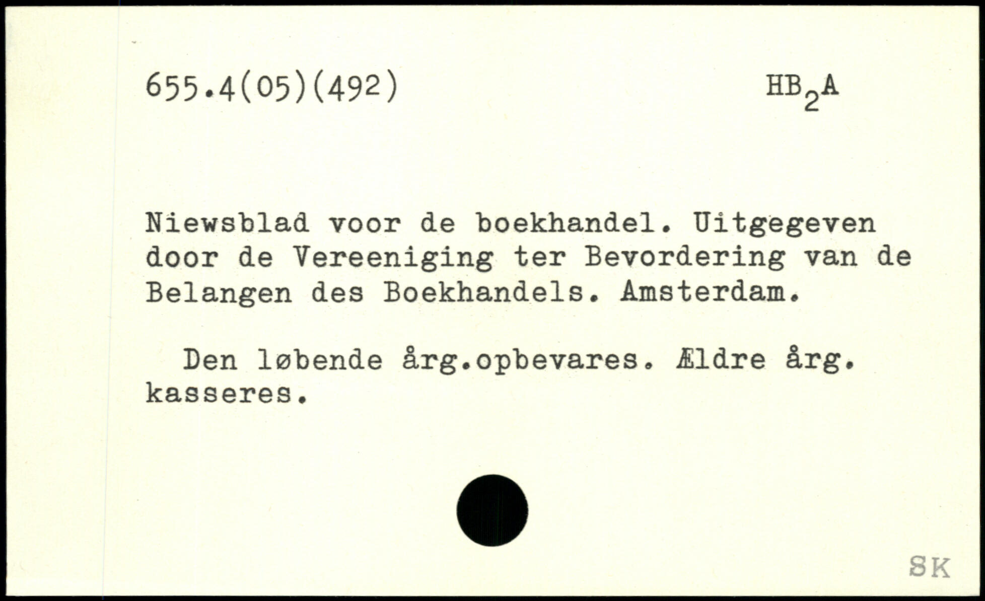 Niewsblad voor de boekhandel. Uitgegeven door de Yereeniging ter Bevordering van de Belangen des Boekhandels. Amsterdam. Den løbende årg.opbevares. Ældre årg. kasseres. 8K