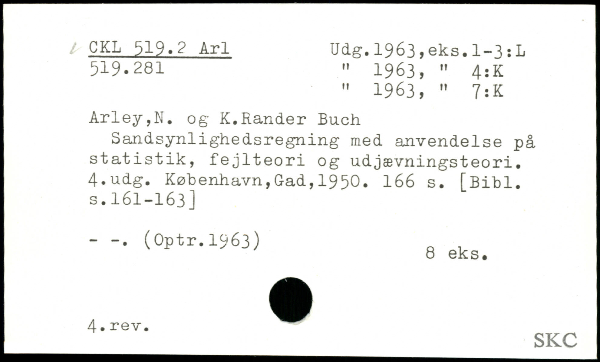 " 1963, " 7:K Arley,N. og K.Kander Buch Sandsynlighedsregning med anvendelse på I statistik, fejlteori og udjævningsteori.