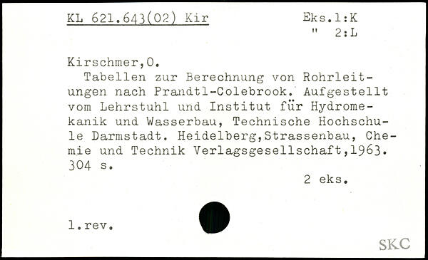 Tabellen zur Berechnung von Rohrleitungen nach Prandt1-Colebrook. Aufgestellt vom Lehrstuhl und Institut für Hydrome-kanik und Wasserbau, Technische Hochschule Larmstadt. Heidelberg,Strassenbau, Chemie und Technik Verlagsgesellschaft,19&3.