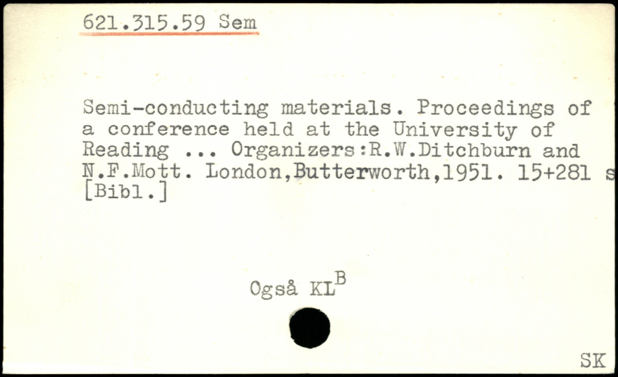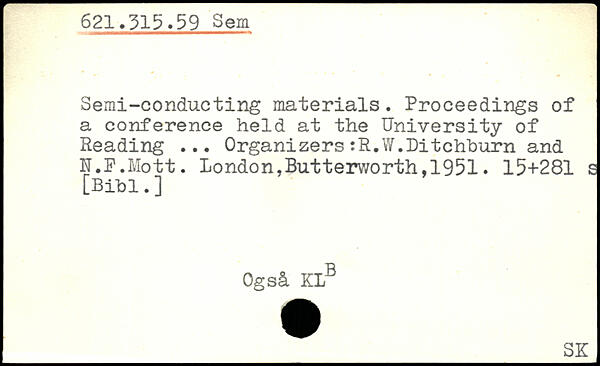 Semi-conducting materials. Proceedings of a conference held at the University of Reading ... Organizers:R.W.Ditchburn and N.F.Mott.