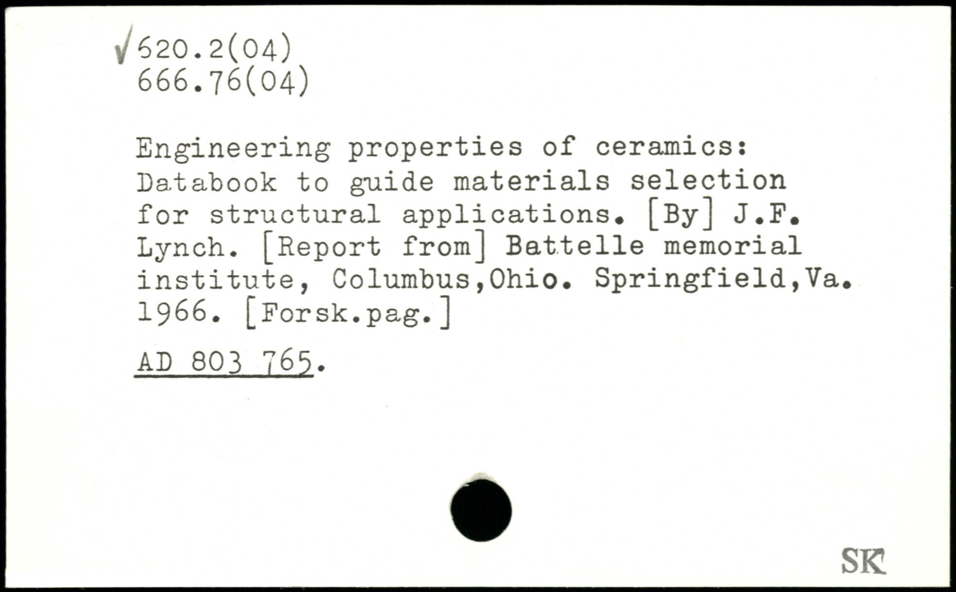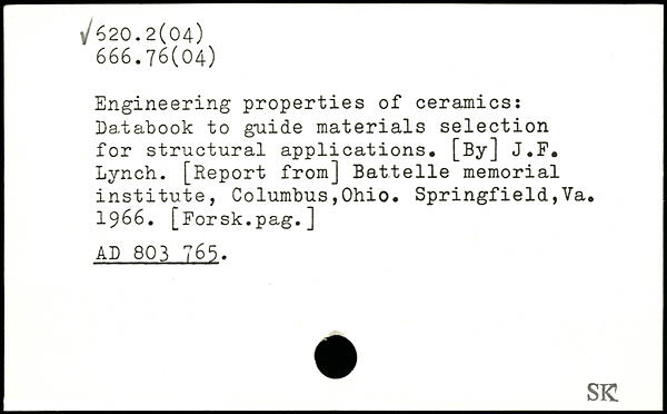 Engineering properties of ceramics: Databook to guide materials selection for structural applications. [By] J.F. Lynch. [Report from] Battelle memorial institute, Columbus,Ohio. Springfield,Ya. 1966. [Forsk.pag.] AD 803 765.