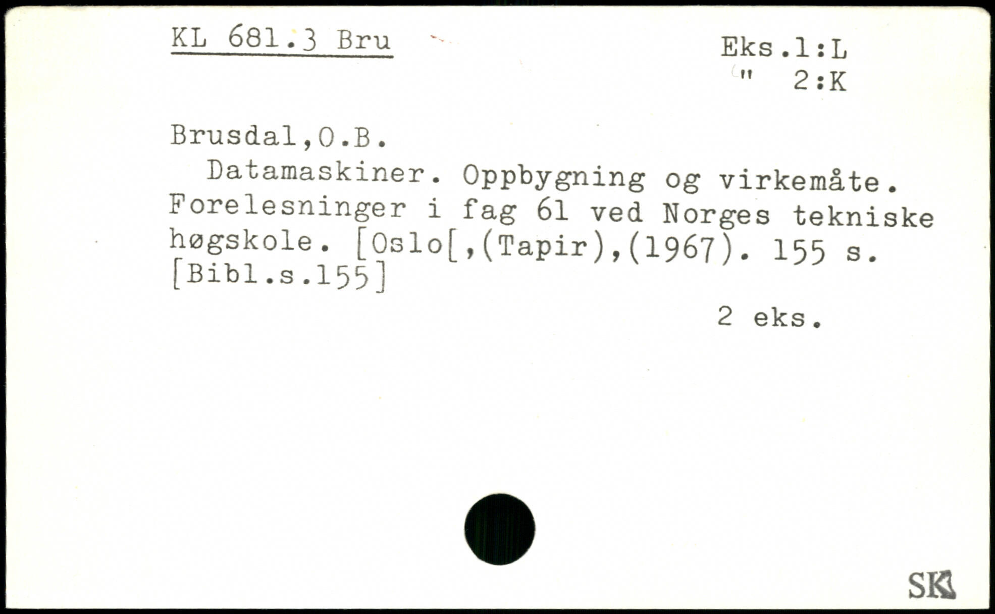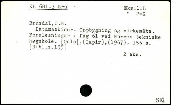 Datamaskiner. Oppbygning og virkemåte. Fore lesninger i fag 6l ved Norges tekniske høgskole. [Oslo[,(Tapir),(1967). I