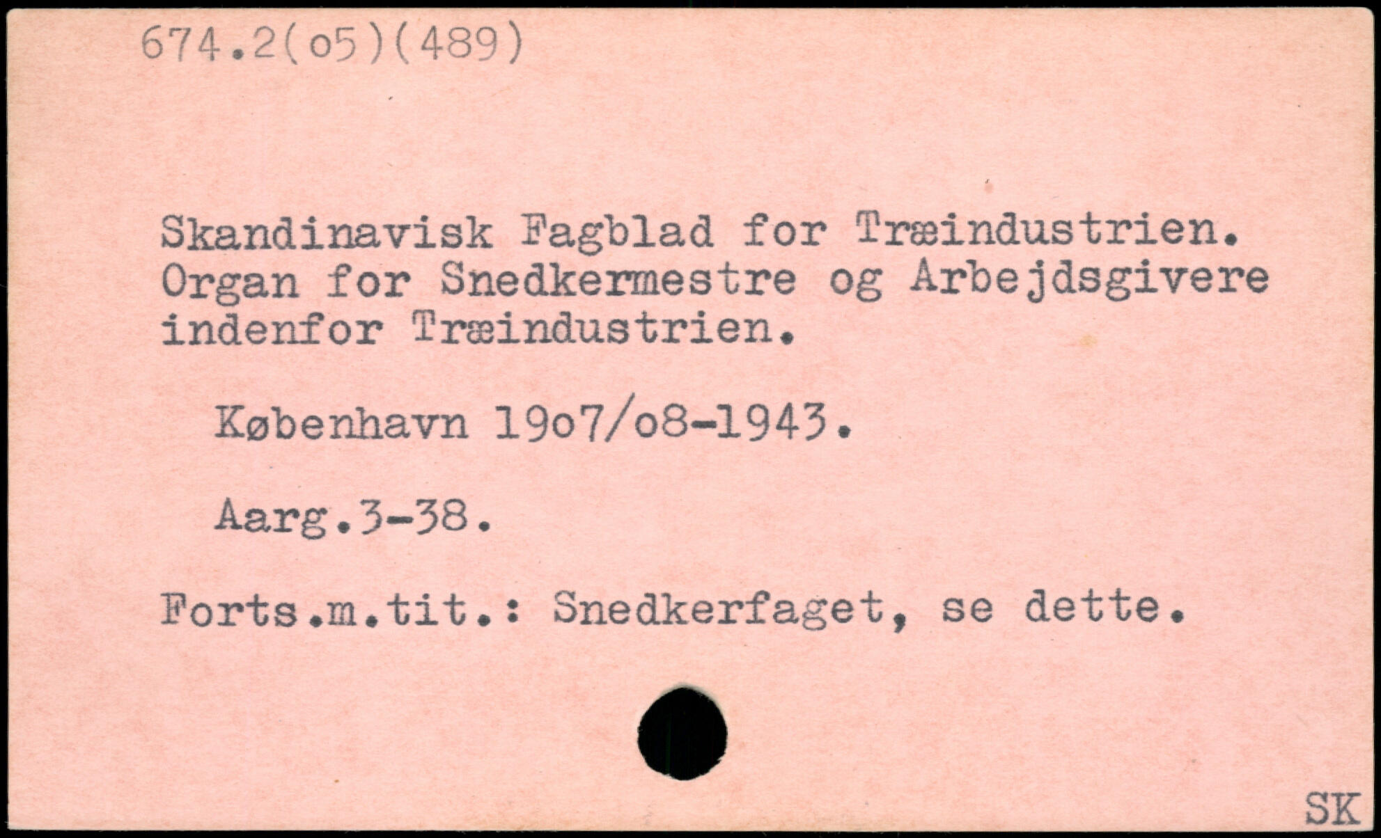 Skandinavisk Fagblad for Træindustrien. Organ for Snedkermestre og Arbejdsgivere indenfor Træindustrien. København 19o7/o8-1943. Aarg.3-38. Forts.m.tit.: Snedkerfaget, se dette. _SK