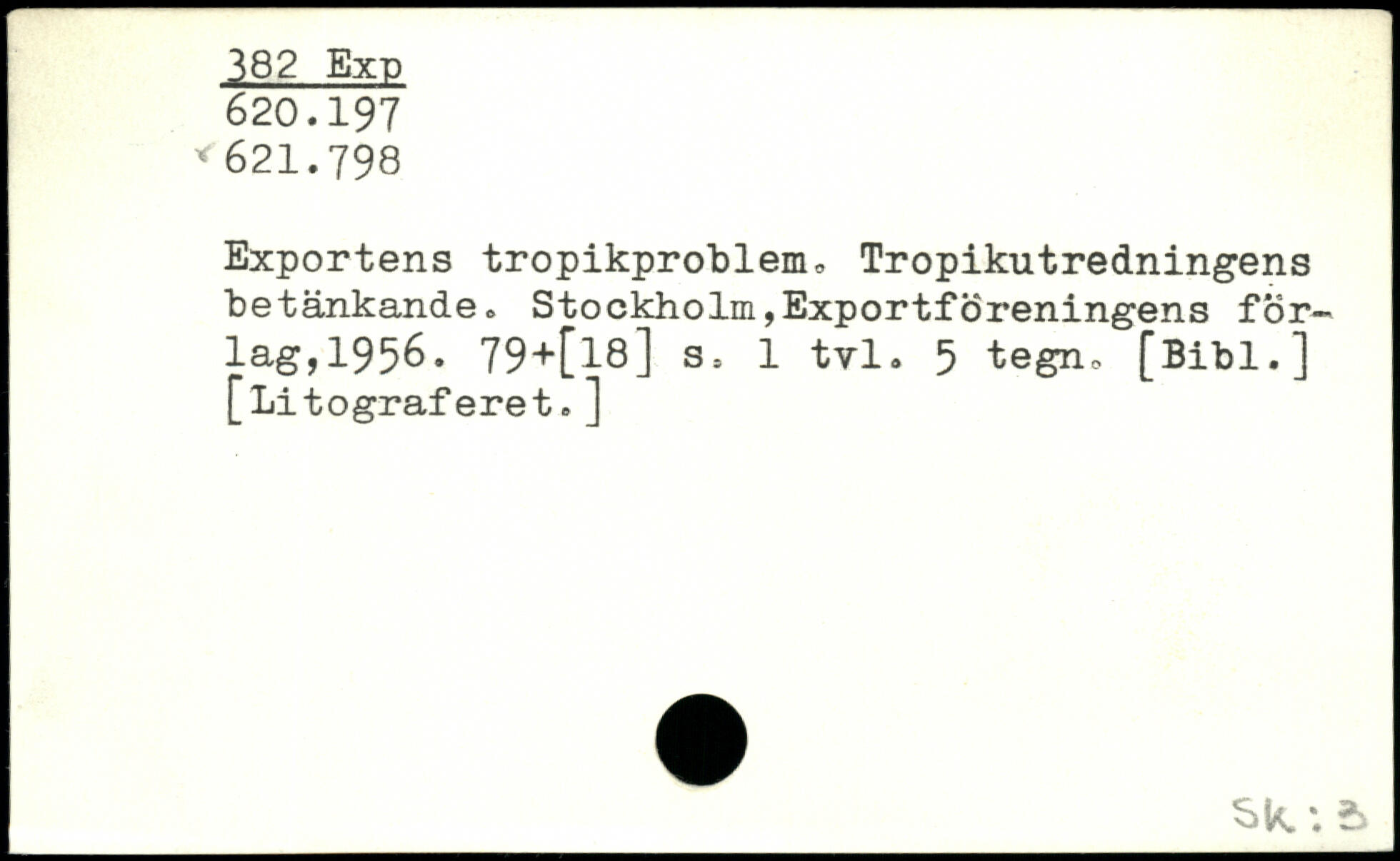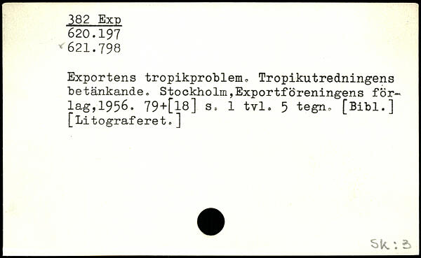 Exportens tropikproblem, Tropikutredningens betänkande, Stockholm,Exportföreningens för-lag,1956. 79+[l8] 3-. 1 tvl. 5 tegn