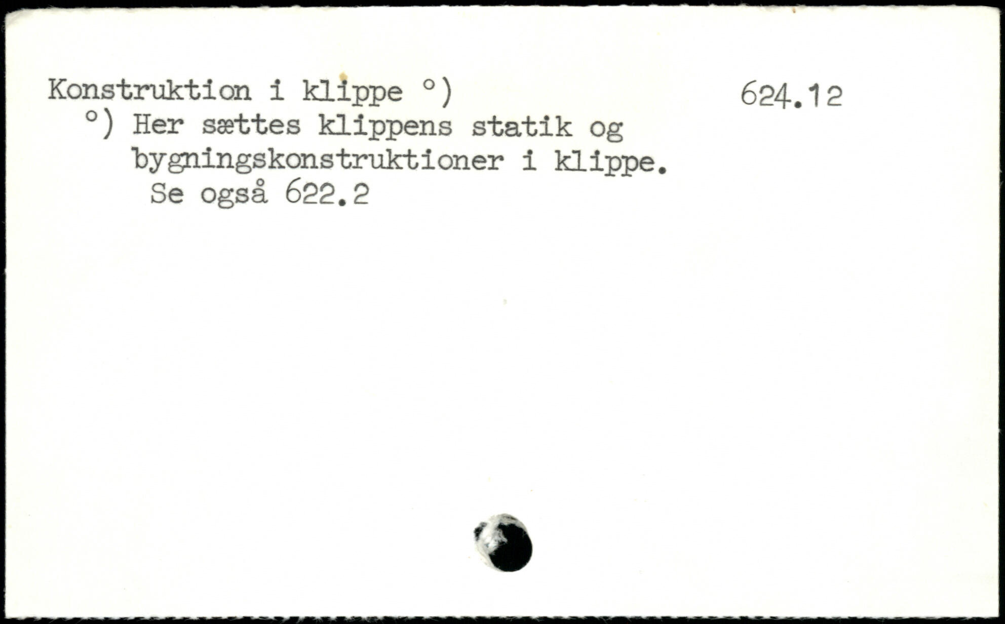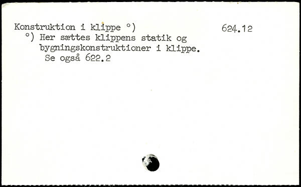 Konstruktion i klippe .) 624.12 .) Her sættes klippens statik og "bygningskonstruktioner i klippe. Se også 622.2