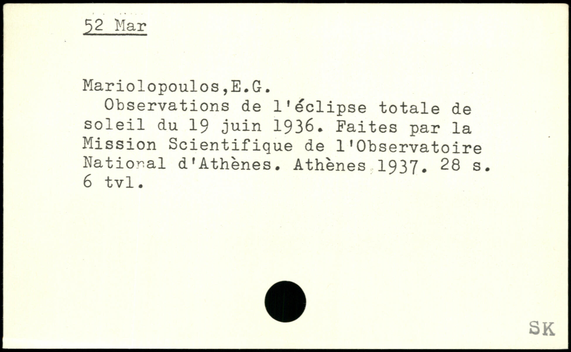Observations de l'éclipse totale de soleil du 19 juin 1936. Faites par la Mission Scientifique de l'Observatoire National d'Athènes. Athènes 1937.