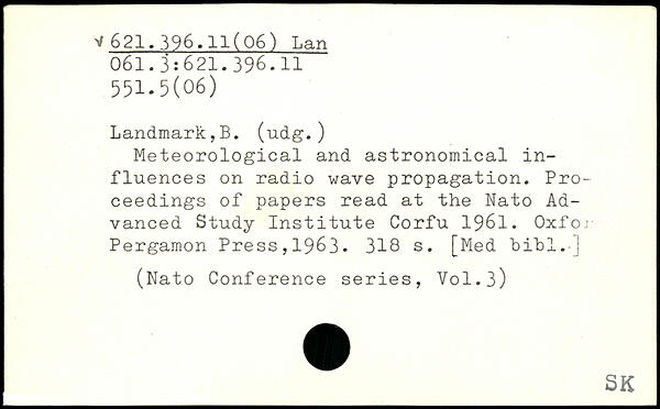 Meteorological and astronomical influences on radio wave propagation. Proceedings of papers read at the Nato Advanced Study Institute Corfu 1961. Oxfor Pergamon Press,1963.