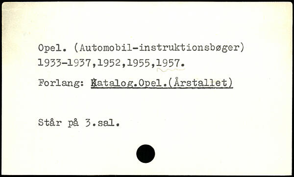 Opel, (Automobil-instruktionsbøger) 1933-1937,1952,1955,1957. Forlang: datalog,Opel.(Årstallet) Står på 3.sal.