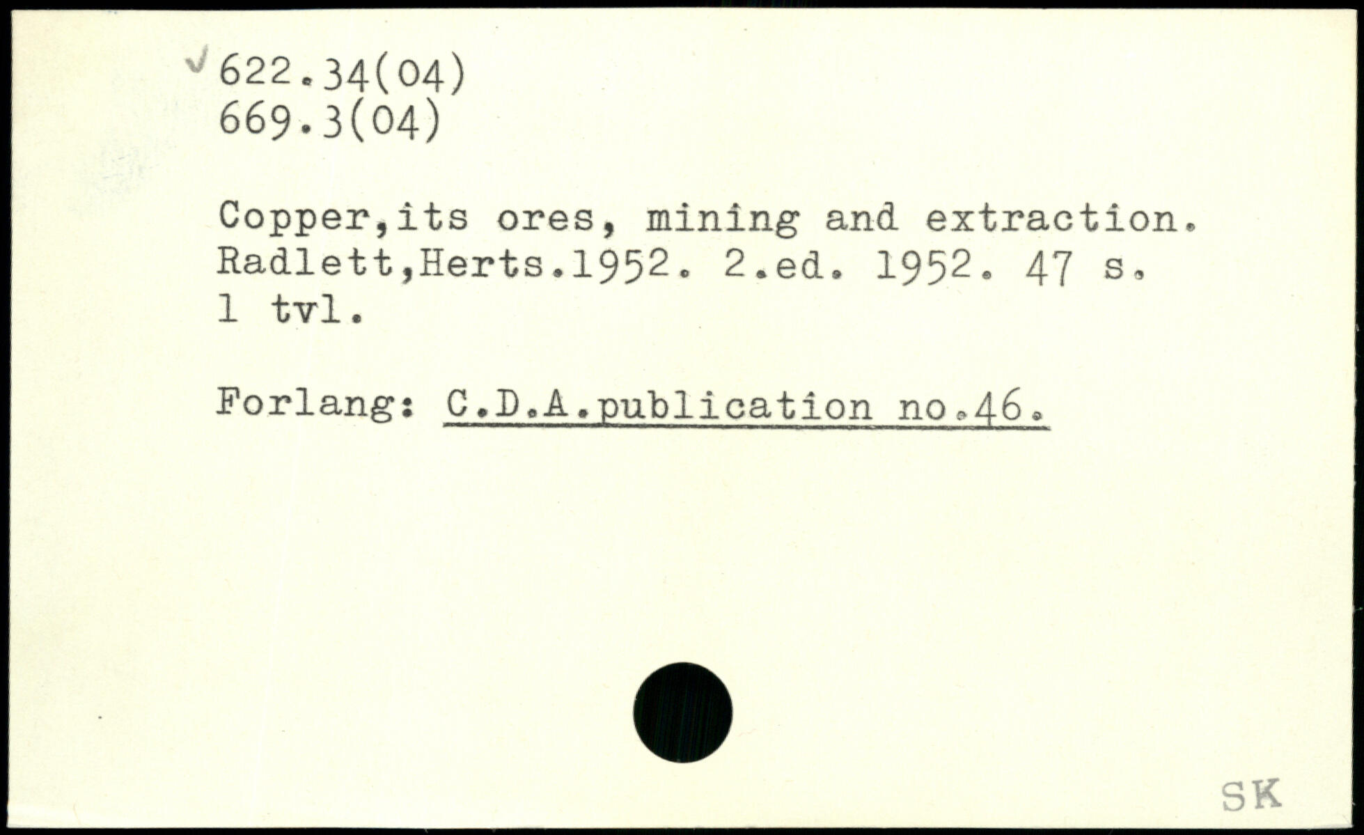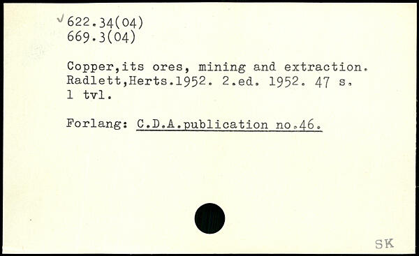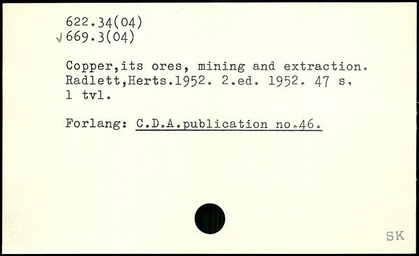 Copper,its ores, mining and extraction. Radlett,Herts.1952.