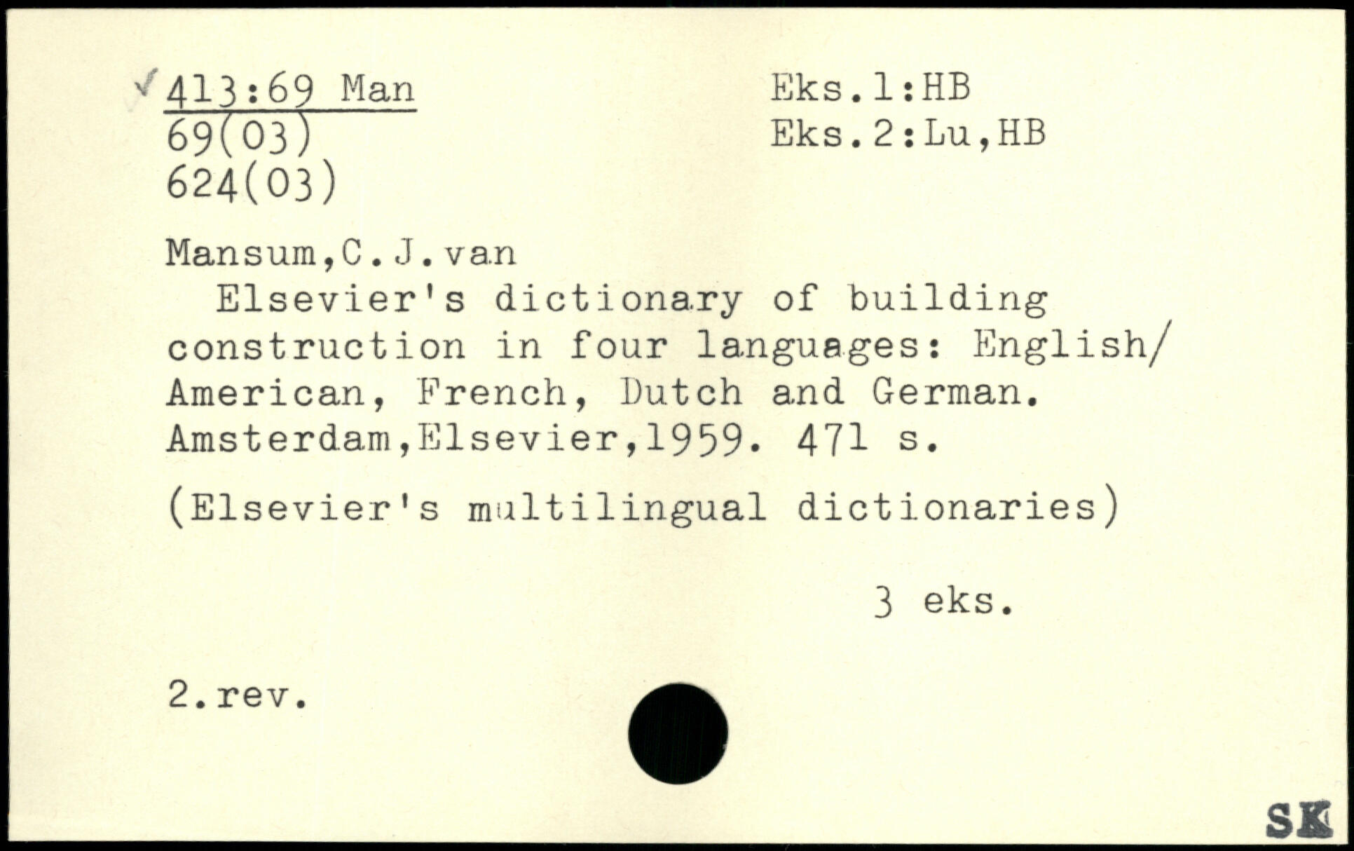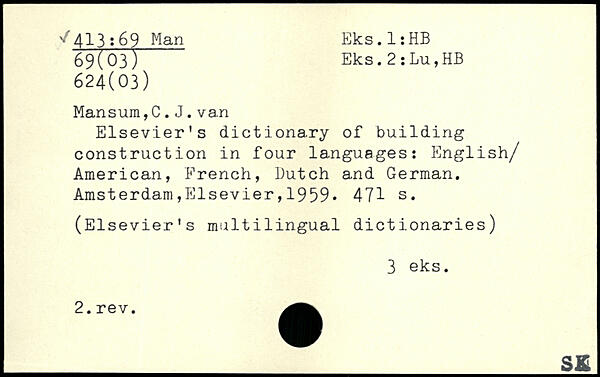 Elsevier's dictionary of building construction in four languages: English/ American, French, Butch and German.