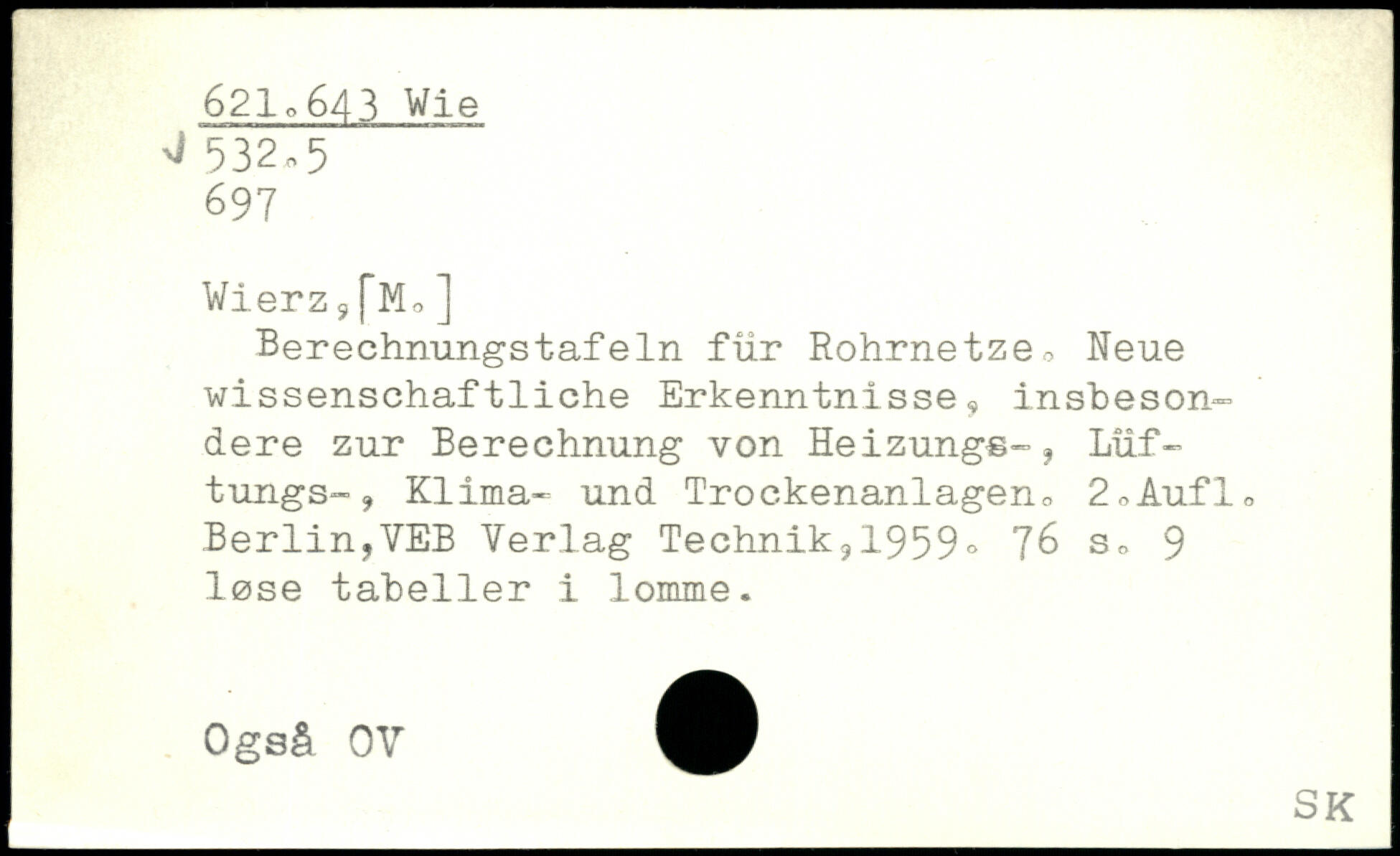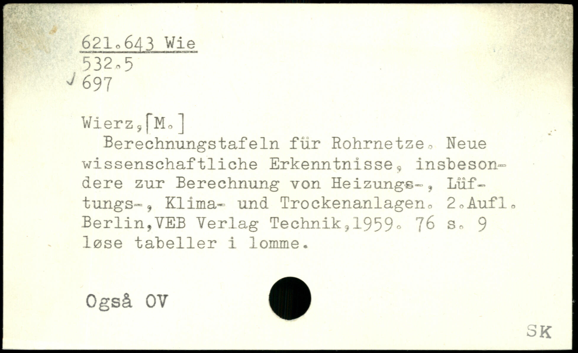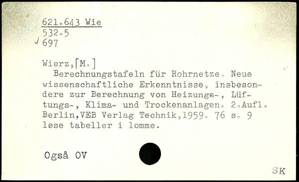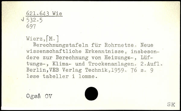 Wierz,[Mo] Berechnungstafeln für Rohrnetze, Neue wissenschaftliche Erkenntnisse, insbesondere zur Berechnung von Heizungs-j Lüf-tungS“, Klima- und Trockenanlagen, 2,Aufl, Berlin?VEB Verlag Technik,, 1959.