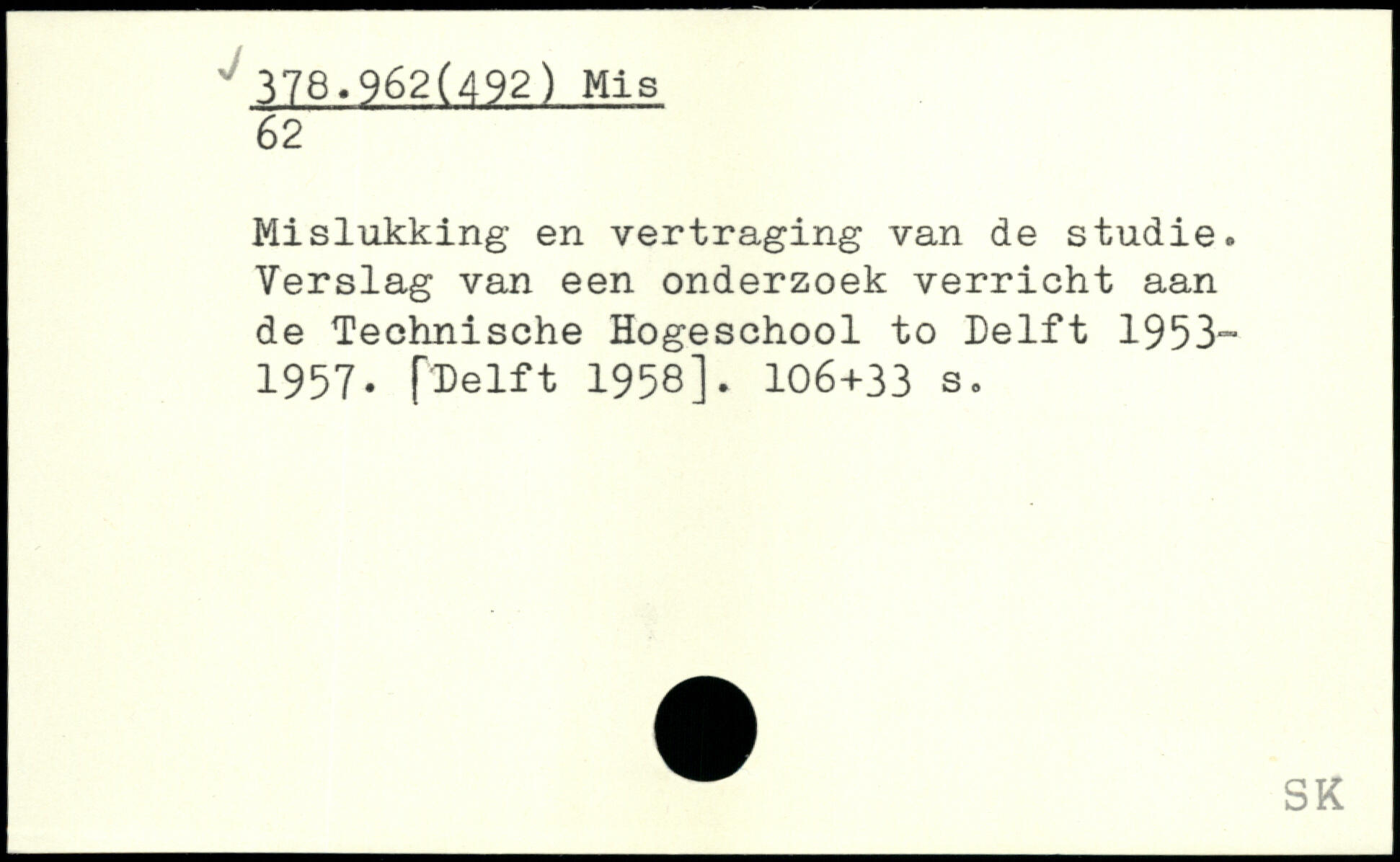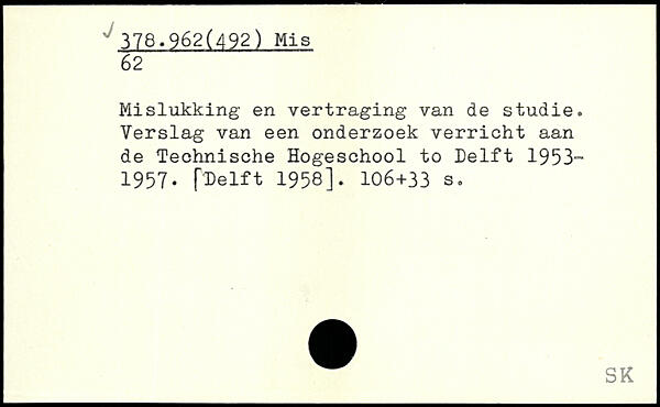 Mislukking en vertraging van de studie. Verslag van een onderzoek verricht aan de Technische Hogeschool to Delft 1953-1957- fDelft 1958].