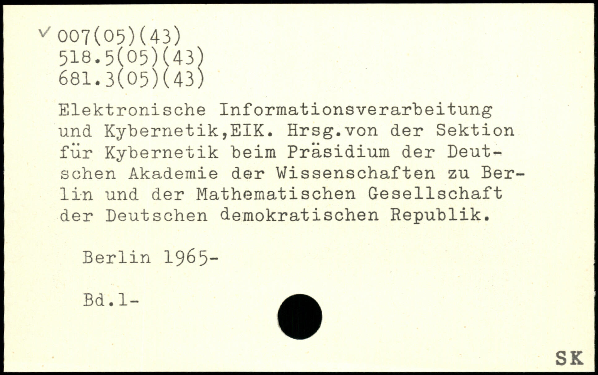 Elektronische InforraationsVerarbeitung und Kybernetik,EIK. Hrsg.von der Sektion für Kybernetik beim Präsidium der Deutschen Akademie der Wissenschaften zu Berlin und der Mathematischen Gesellschaft der Deutschen demokratischen Republik.