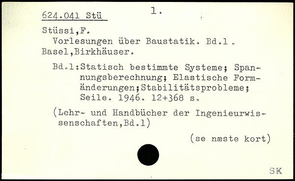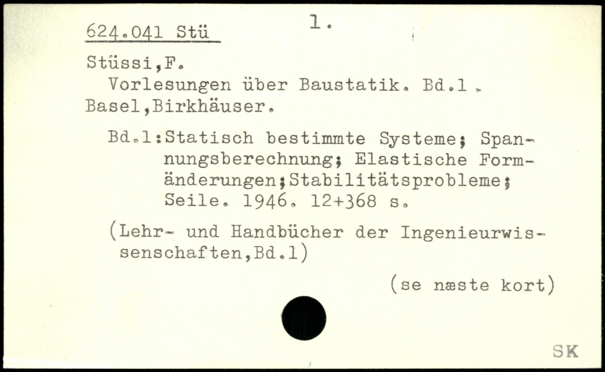 Vorlesungen über Baustatik. Bd.l , Basel,Birkhäuser. Bd.l:Statisch bestimmte Systeme; Span-nungsberechnung; Elastische Formänderungen ;Stabilitätsprobleme; Seile. 1946.