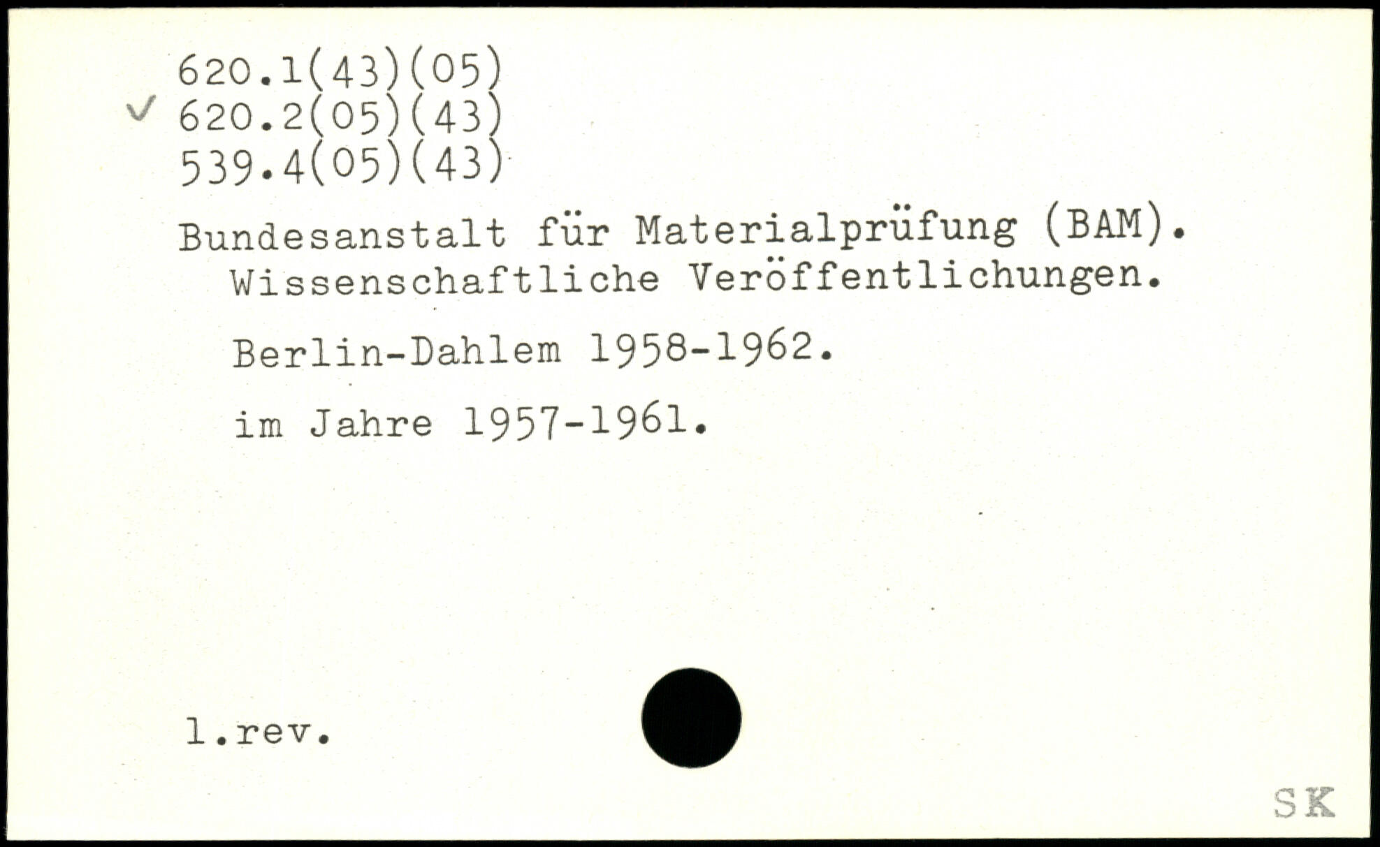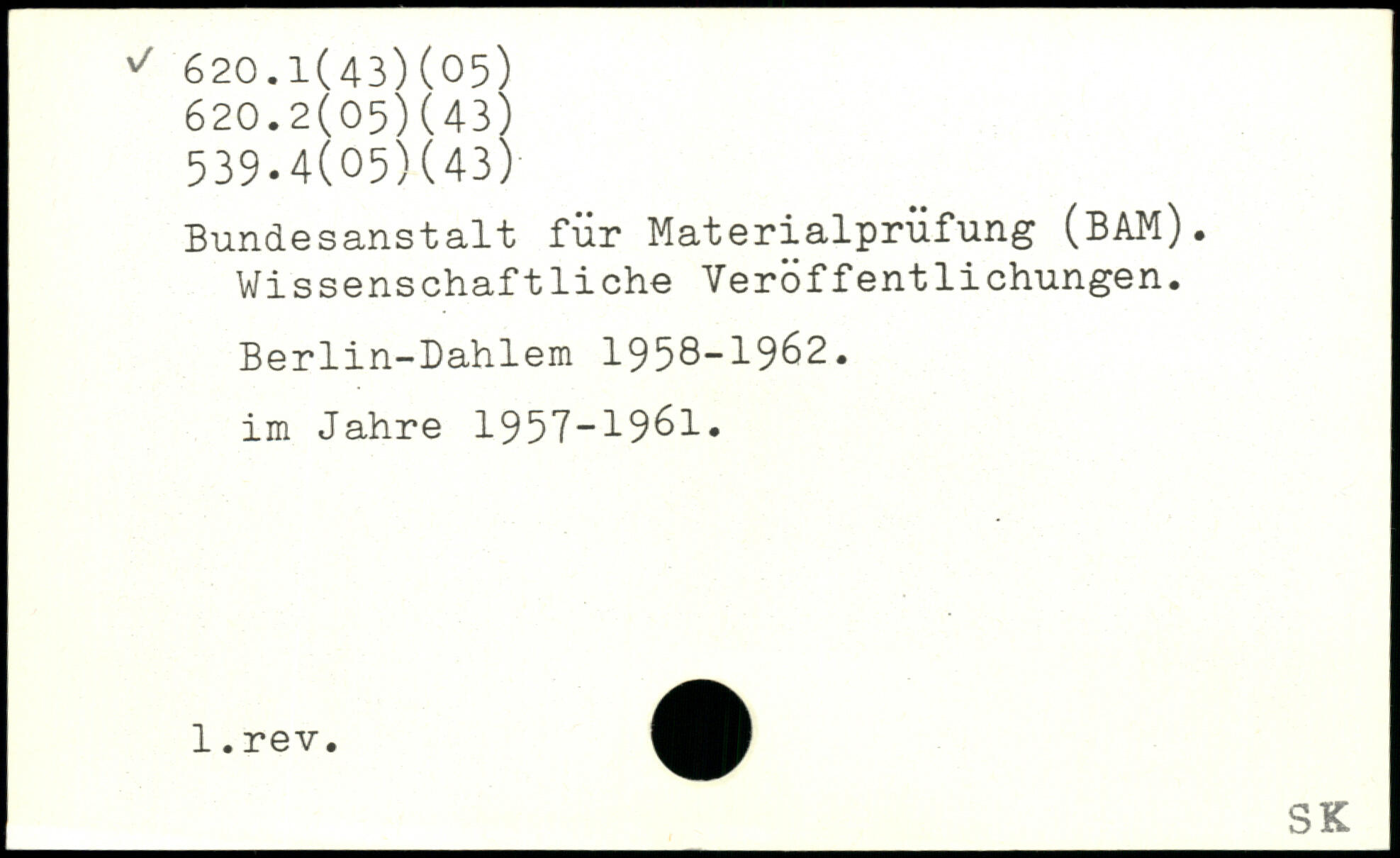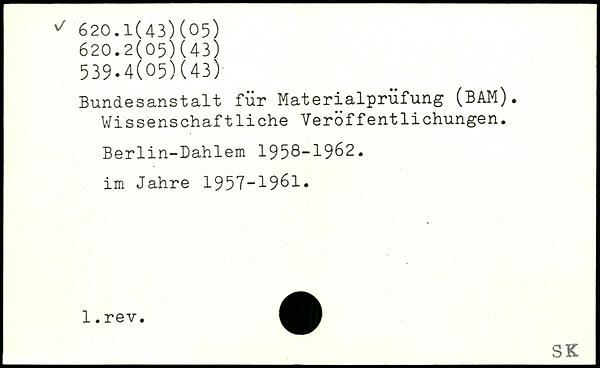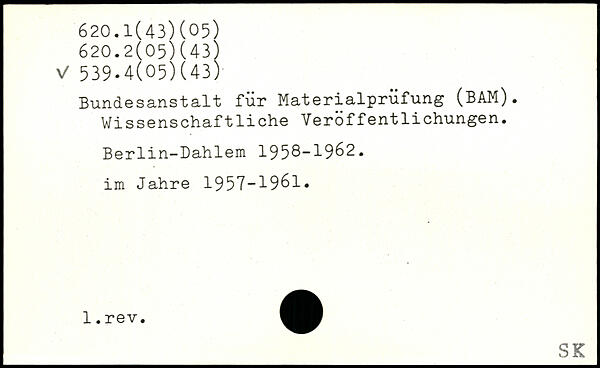 Bundesanstalt für Materialprüfung (BAM). Wissenschaftliche Veröffentlichungen. Berlin-Dahlem 1958-1902. im Jahre 1957-1961.