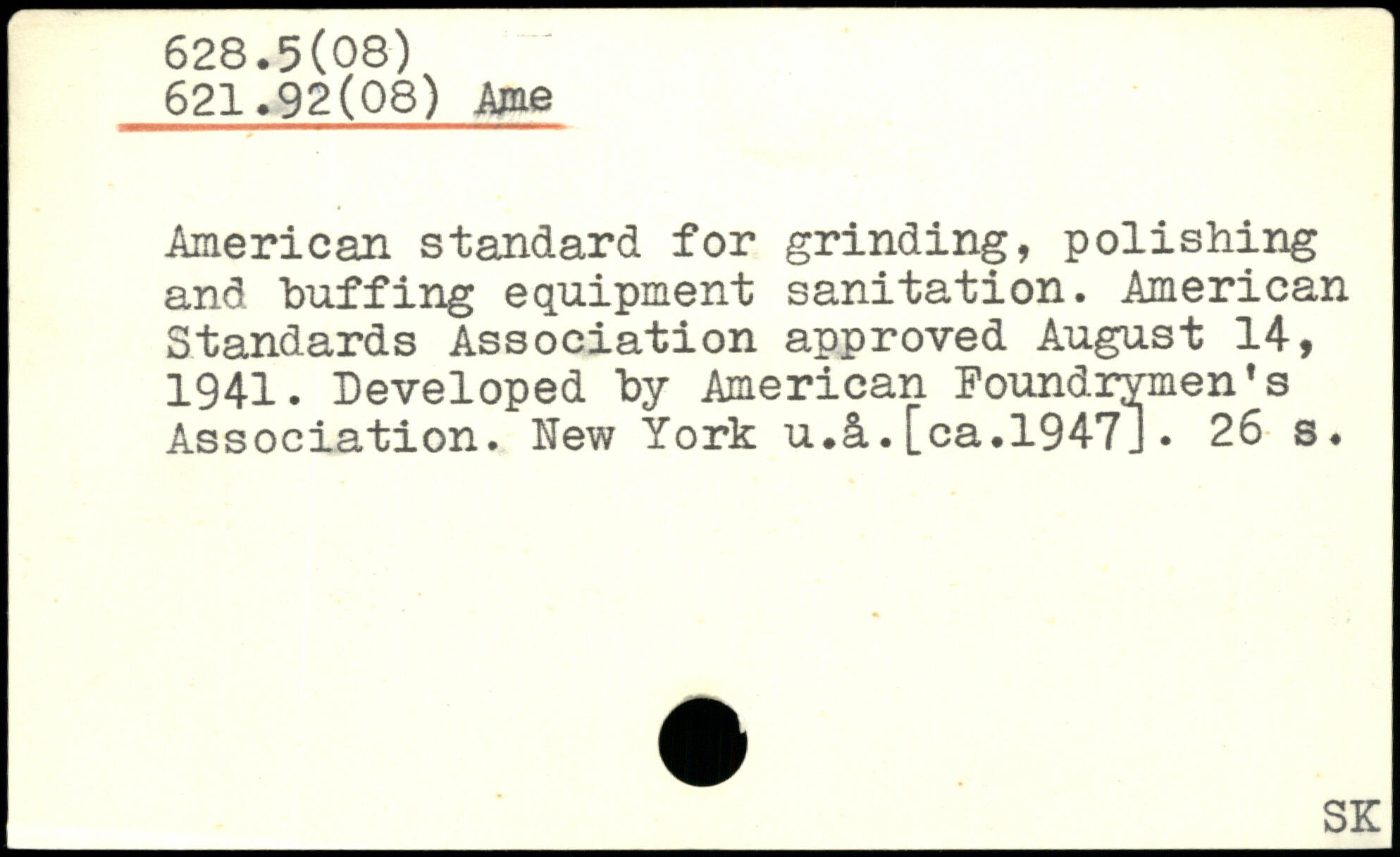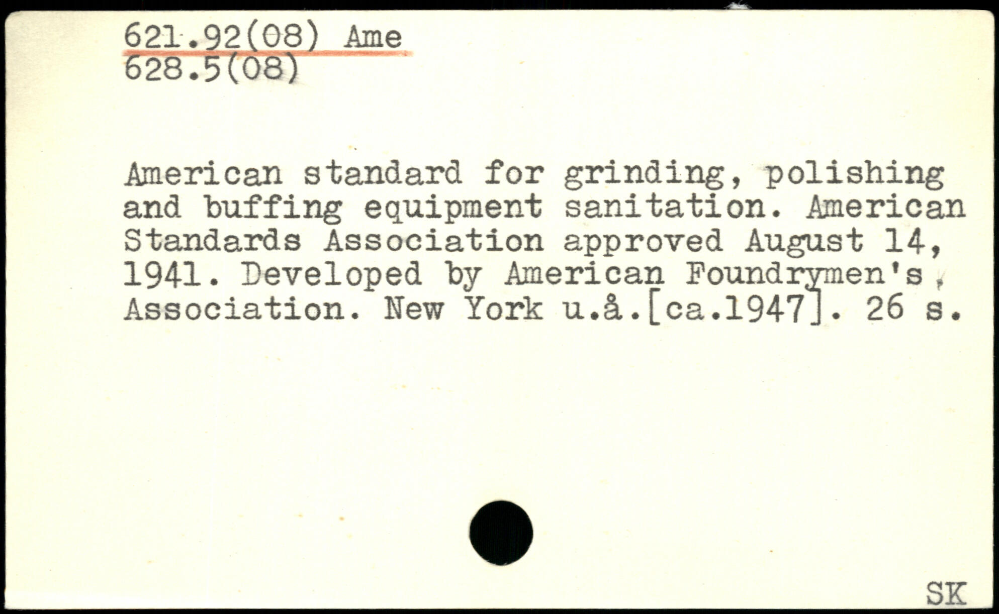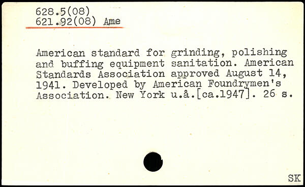 American standard for grinding, polishing and buffing equipment sanitation. American Standards Association approved August 14, 1941. Developed by American Foundrymen's , Association. New York u.â.[ca.1947J.