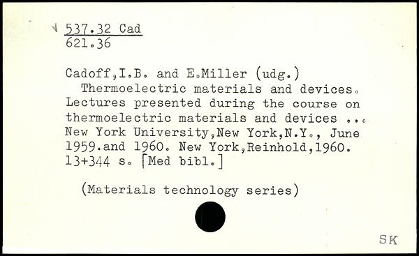 Thermoelectric materials and devices. Lectures presented during the course on thermoelectric materials and devices ... New York University,New York,N.Y0, June 1959.and 1960.