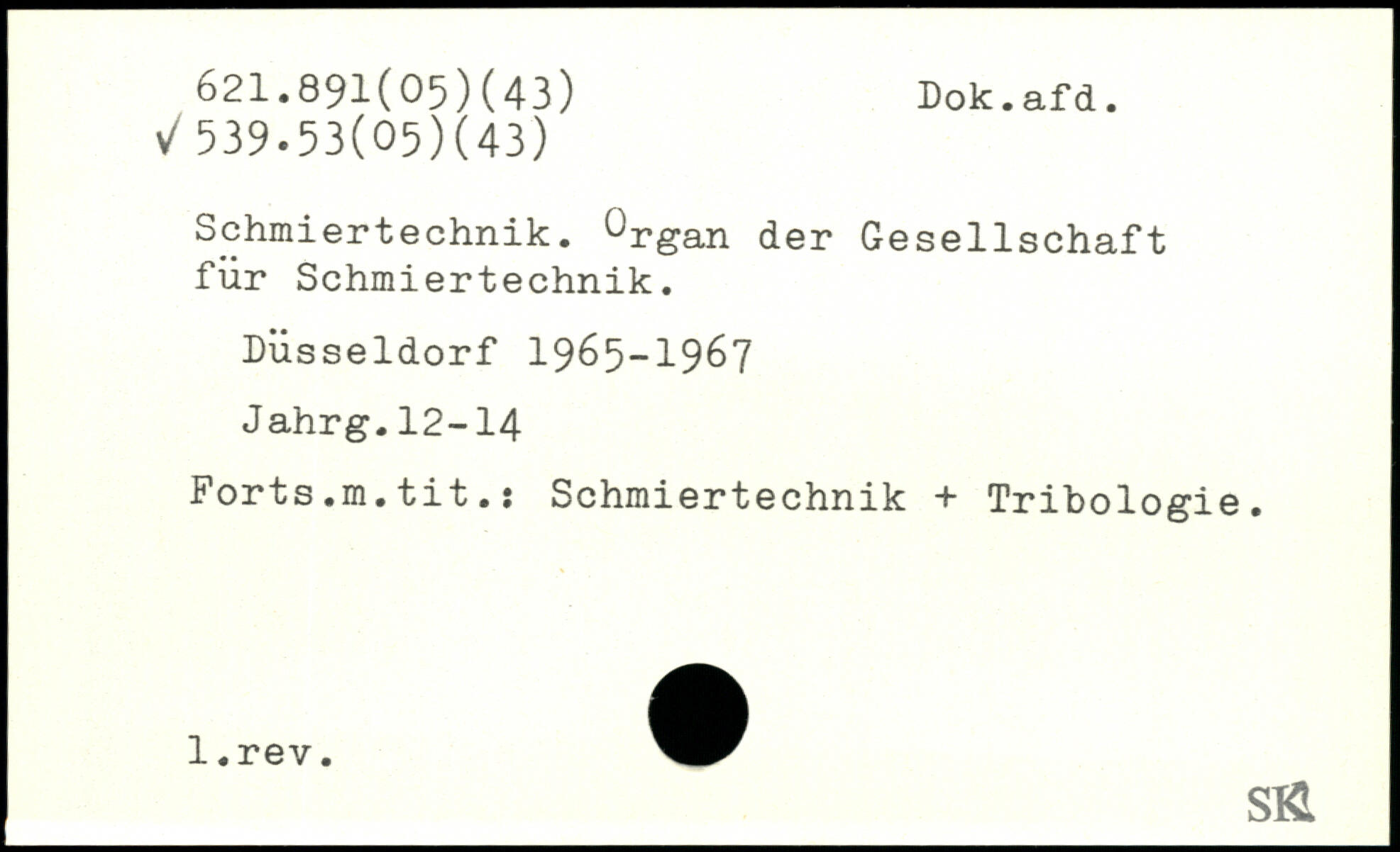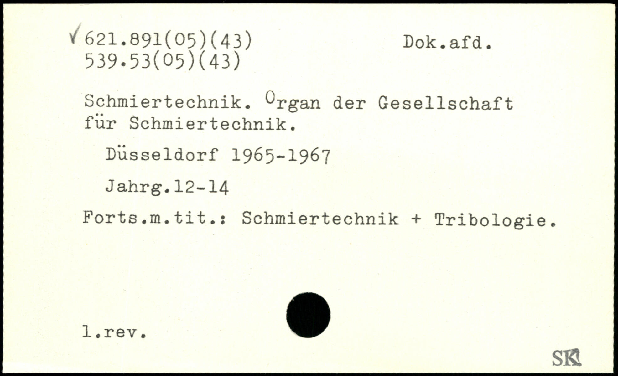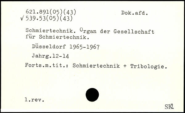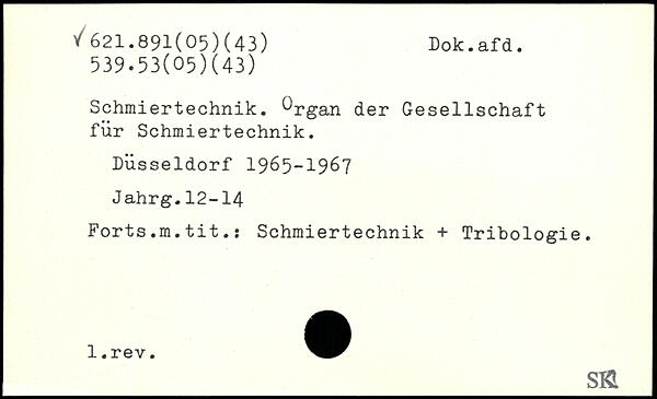 Schmiertechnik. Organ der Gesellschaft für Schmiertechnik. Düsseldorf 1965-1967 Jahrg.12-14 Forts.m.tit.: Schmiertechnik + Tribologie.