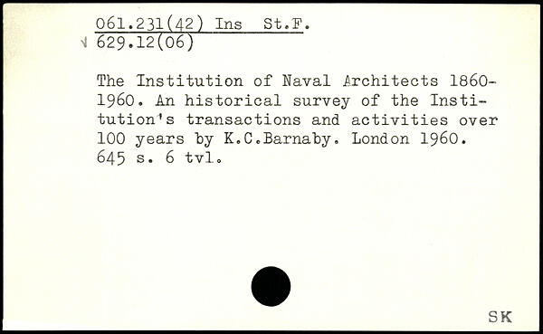 The Institution of Naval Architects 1860-1960. An historical survey of the Institution’s transactions and activities over 100 years by K,C.Barnaby.
