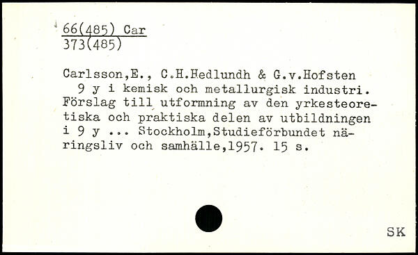 Carlsson,E. , C.H.Hedlundh & G.v.Hofsten 9 y i kemisk och metallurgisk industri. Förslag till utformning av den yrkesteore-tiska och praktiska delen av utbildningen i 9 y ...