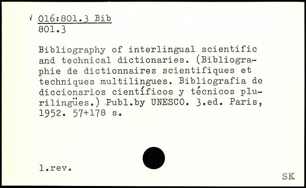 Bibliography of interlingual scientific and technical dictionaries. (Bibliographie de dictionnaires scientifiques et techniques multilingues. Bibliografia de diccionarios cientificos y tecnicos plu-rilingües.)
